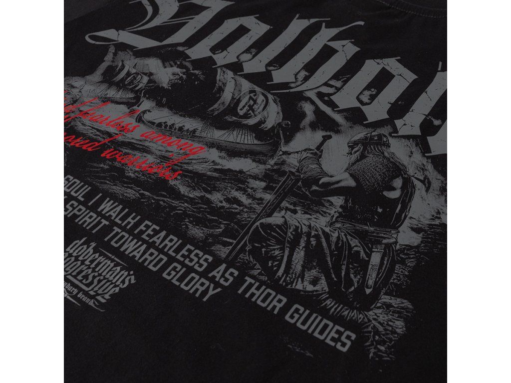 Bordázott szegéllyel ellátott kerek nyakkivágással, valamint bordázott mandzsettával és alsó résszel készült modell, amely jó illeszkedést és kényelmes viseletet biztosít. A bal mellrészen egy kisebb „Valhalla” felirat és grafikai szimbólum található. A hátoldalt egy nagyméretű, részletgazdag, skandináv mitológia ihlette nyomat díszíti – harcos motívummal és jellegzetes „Valhalla” tipográfiával. A dizájnt a bátorságra, becsületre és harcra utaló szlogenek teszik teljessé, kiemelve a kollekció nyers, harcos jellegét.