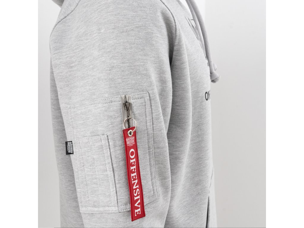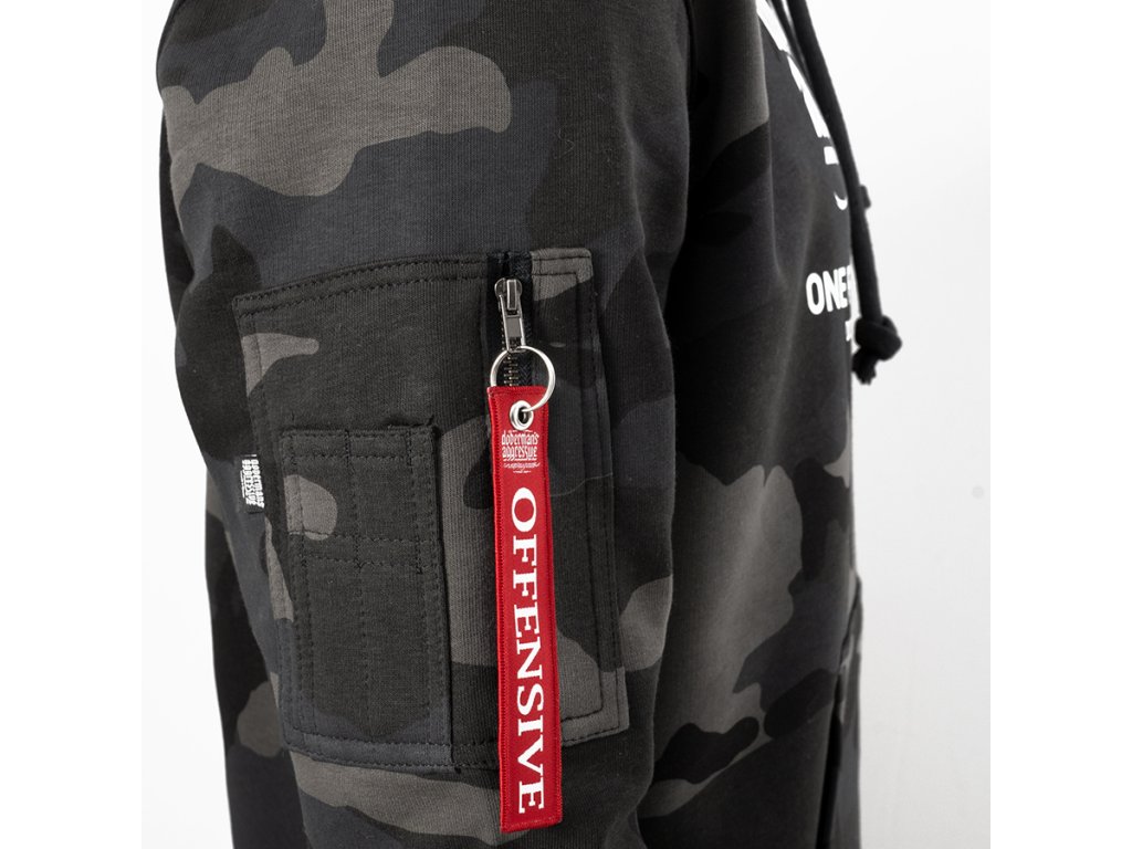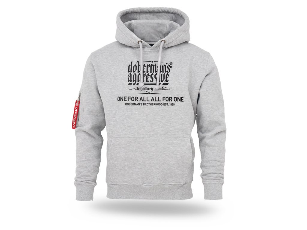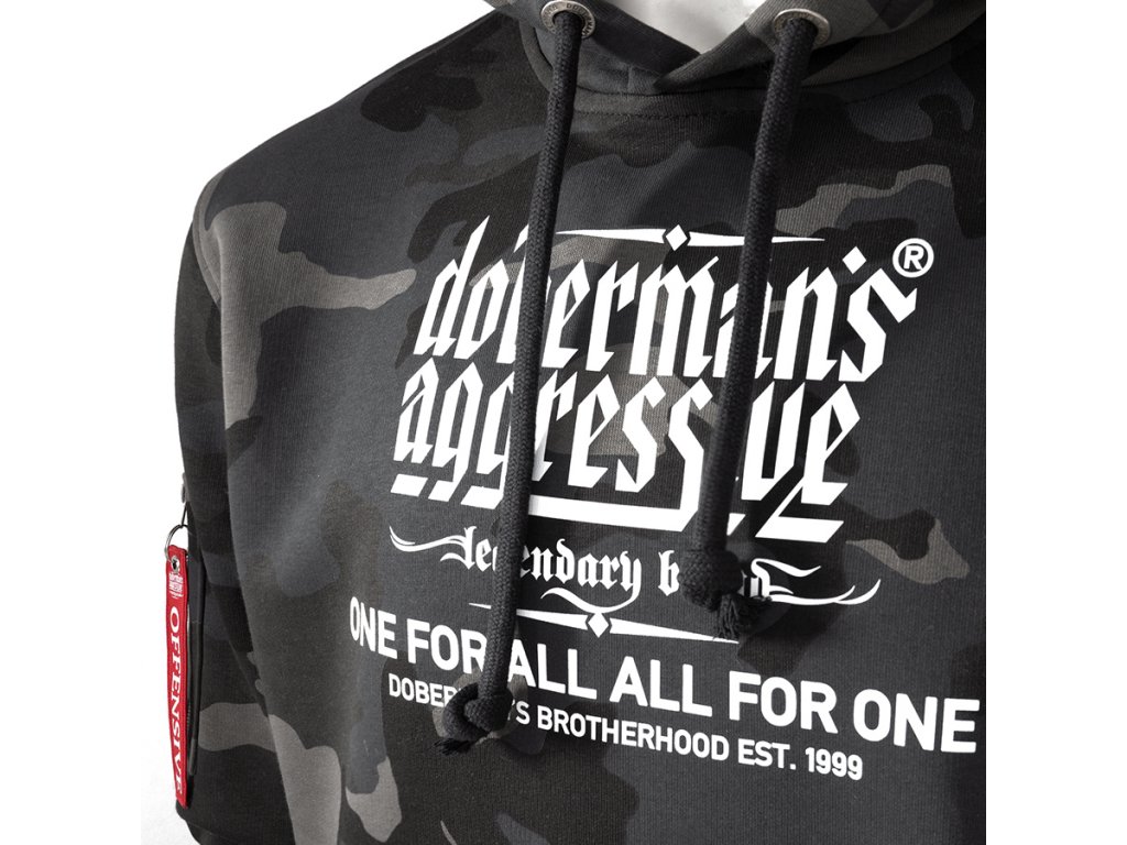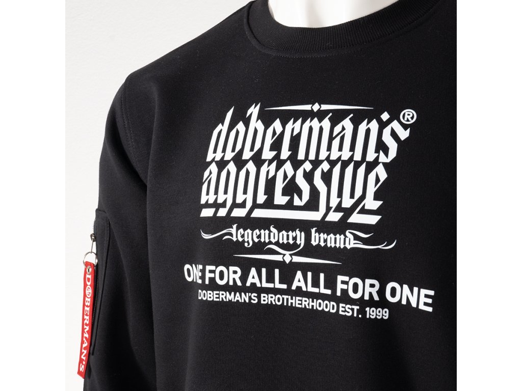 Állítható kapucnival és elöl nagy kenguruzsebbel készült modell. Az ujján további cipzáras zseb található jellegzetes függő címkével. Az alsó rész és az ujjak vége rugalmas passzéval készült a jobb illeszkedés és kényelem érdekében. Az elején markáns nyomat látható a „Doberman’s Aggressive – legendary brand” logóval és a „One for all, all for one – Doberman’s Brotherhood est. 1999” szlogennel, amely a márka identitását és karakterét hangsúlyozza. Az összhatás a funkcionalitást erőteljes, könnyen felismerhető stílussal ötvözi.