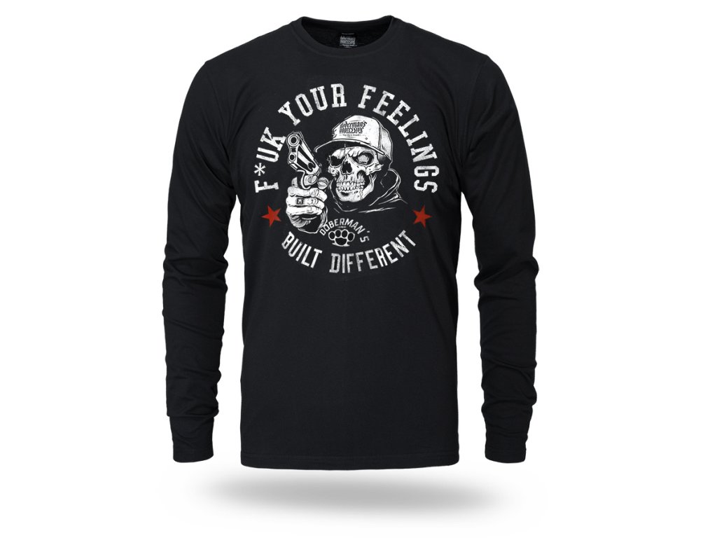 Kényelmes, klasszikus szabású modell kerek nyakkivágással, amelyet rugalmas passzé zár le. Az elején egy nagyméretű, feltűnő nyomat látható: sapkát viselő, fegyvert tartó koponya, amelyet a „F*ck Your Feelings – Built Different” felirat és a Doberman’s Aggressive márkára jellemző grafikai elemek vesznek körül. A dinamikus design lázadó és kompromisszummentes karaktert hangsúlyoz, amelyet az utcai kultúra inspirált. A póló kényelmes viseletet biztosít a mindennapokban.