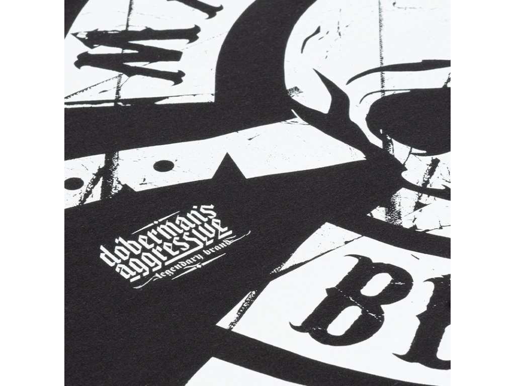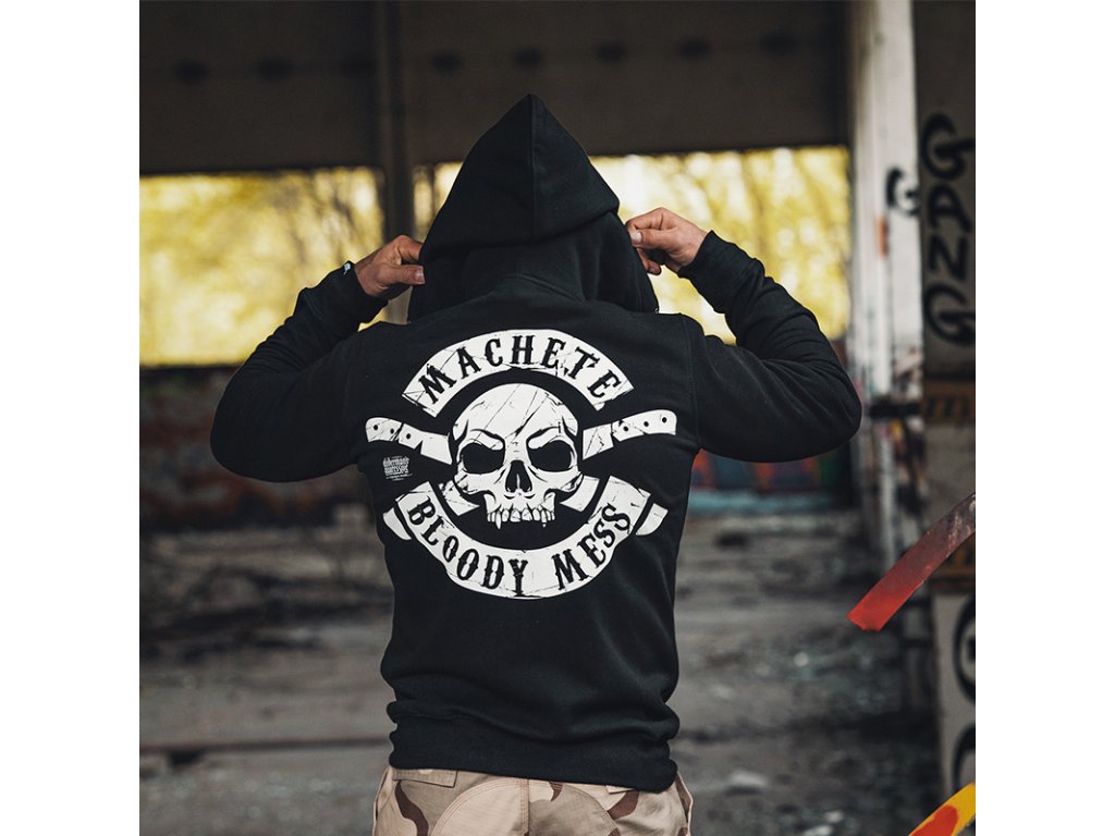 A pulóver bal ujján Doberman's Aggressive logó található. A kapucnis pulcsi hátulján egy kör alakú nyomat található, amely egy koponyát és egy MACHETE BLOODY MESS feliratot, valamint egy kisebb DOBERMAN'S logót ábrázol. A pulóver hátoldalán egy kisebb méretű identikus nyomat található.