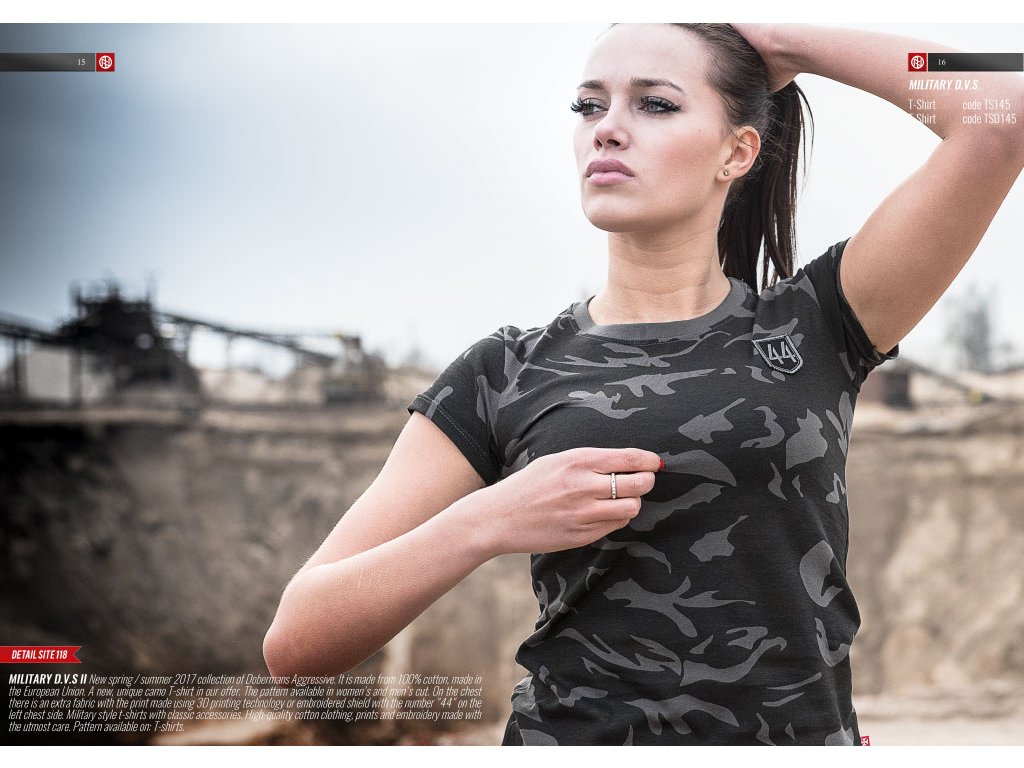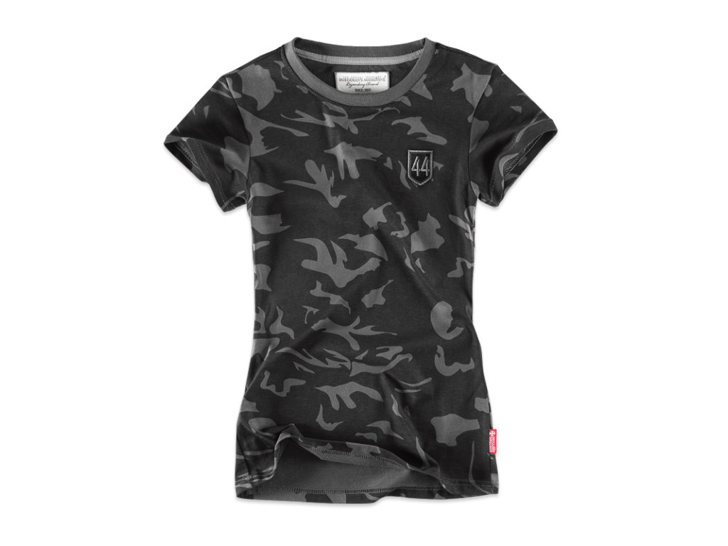 Női modell, derékvonal, kerek nyakú. Póló készült kiváló minőségű pamutból, álcázó színben. Bal mellkasa oldalon hímzett jelvényt 44 számmal. Hímzés szürke szinben. Póló háta sima.