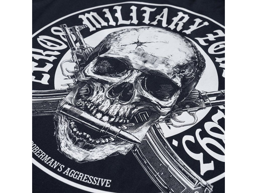 Kényelmes, klasszikus szabású modell, amely ideális a mindennapi viselethez. A hátoldalon egy nagyméretű, karakteres grafika látható, amely egy koponyát ábrázol keresztbe tett puskák előtt, a „Frontline Military Zone 1987” felirattal körülvéve. A motívum katonai stílus által inspirált, és hangsúlyozza a design nyers, határozott karakterét. A mellrészen egy kisebb nyomat található, amely a hátoldali grafikára utal, és kiegészíti az összképet. A póló kerek nyakkivágással, rugalmas passzéval és hosszú ujjakkal készült, így jól illeszkedik a testhez és tökéletes a mindennapi használatra.