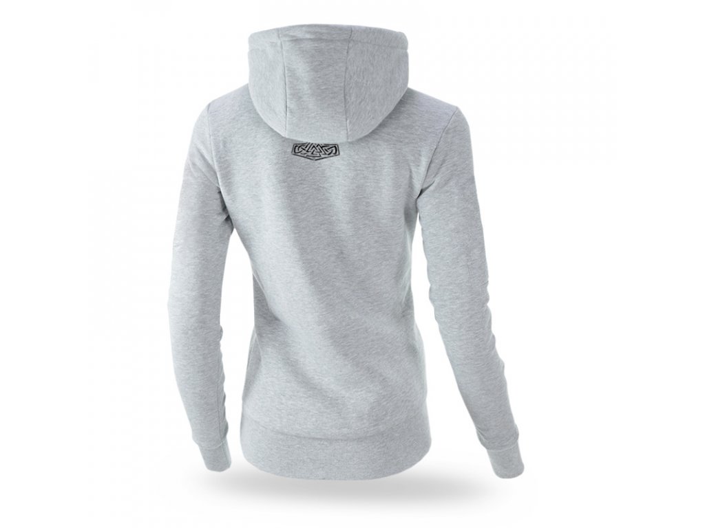Kiváló minőségű pamutból készült női pulóver. A kapucni beállításához praktikus fűzők szolgálnak, végein fémből készült logókkal.