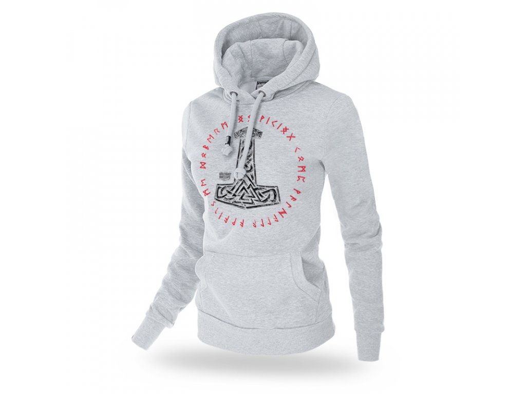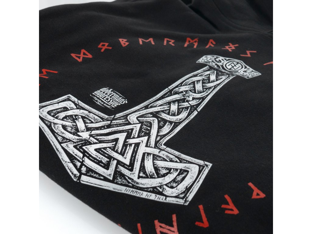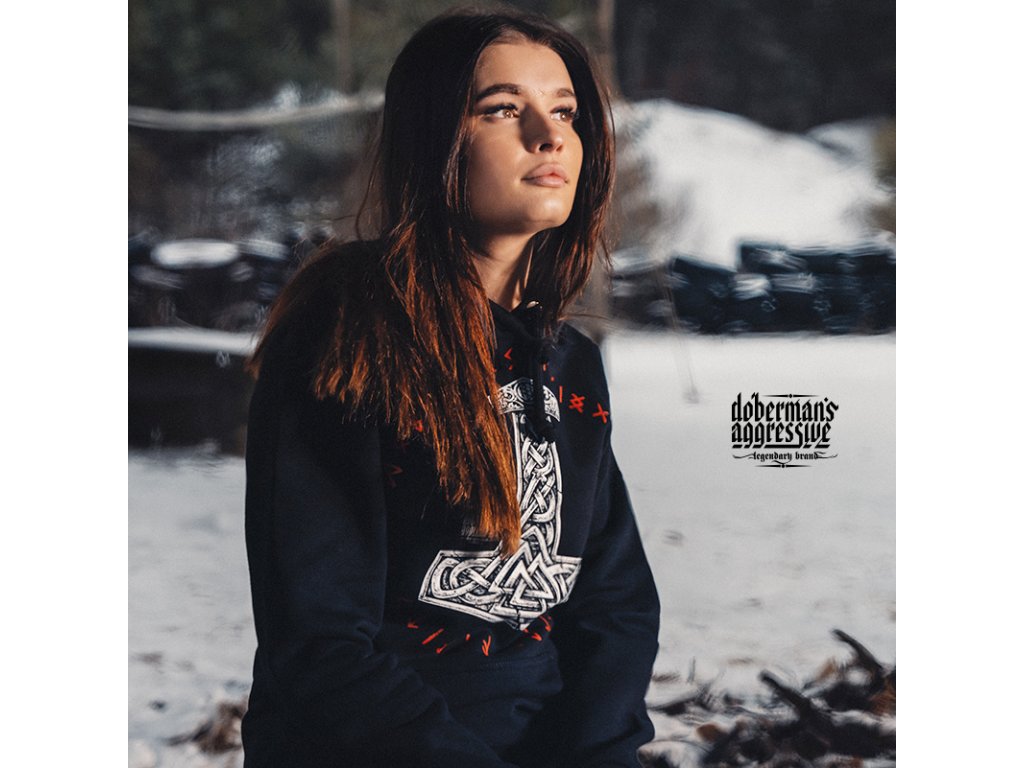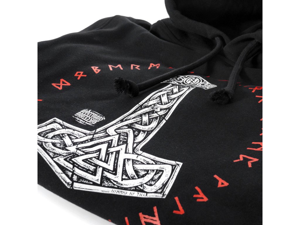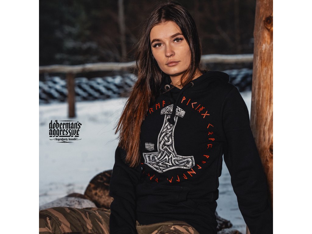 A pulóver alsó részén és az újjak végein elasztikus szegély található. A pulóver bal ujján egy kis méretű Doberman’s Aggressive logó található. A pulóver elején egy Thor kalapács és a márka logója található, amely piros rúna szimbólumokkal van körülvéve. A pulóver hátoldalán egy kis méretű Thor kalapács mintája található. A pulóver testre szabott és hosszabb szabású, ami jelentősen növeli a viselés kényelmét. A kapucni beállításához praktikus fűzők szolgálnak, végein fémből készült logókkal. A pulóver alsó részén és az újjak végein elasztikus szegély található.