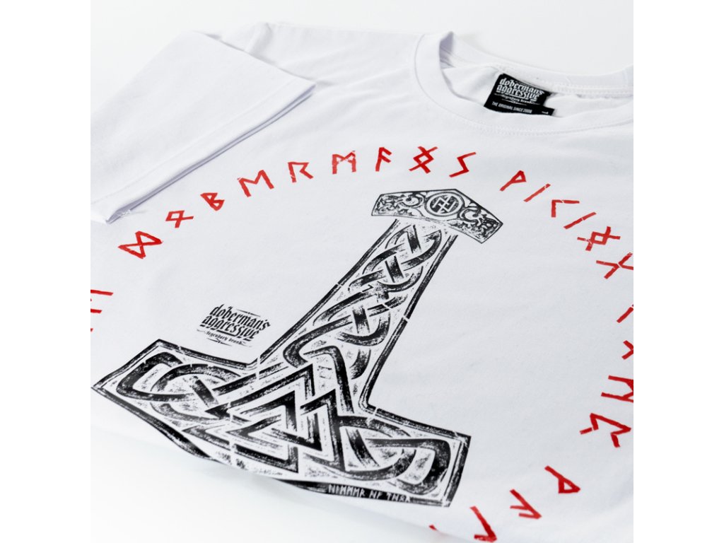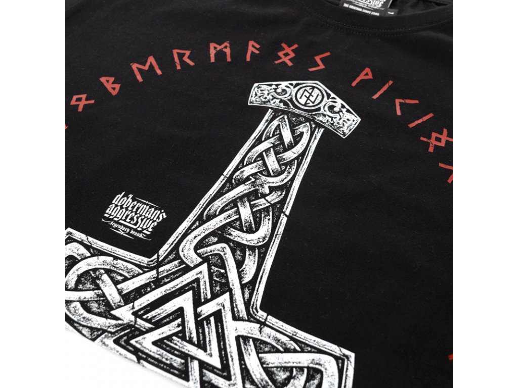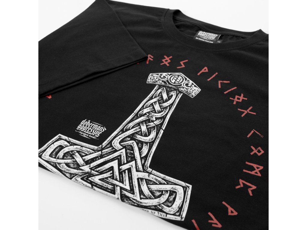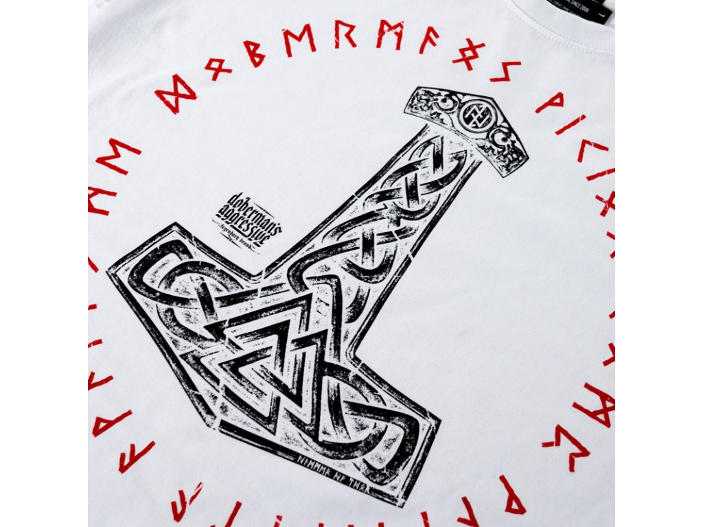 A póló bal ujján egy kis méretű céges logó található. A póló elején egy Thor kalapács és a márka logója található, amely piros rúna szimbólumokkal van körülvéve. A póló hátoldalán egy kis méretű Thor kalapács mintája található.