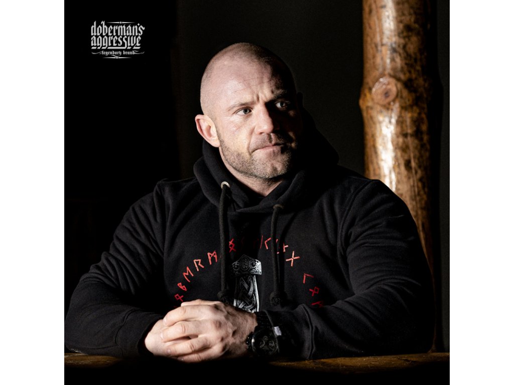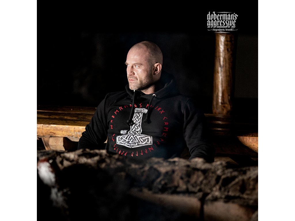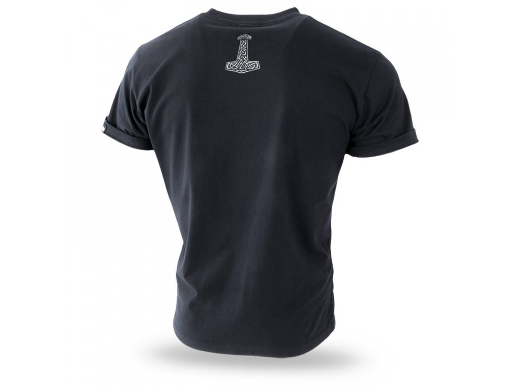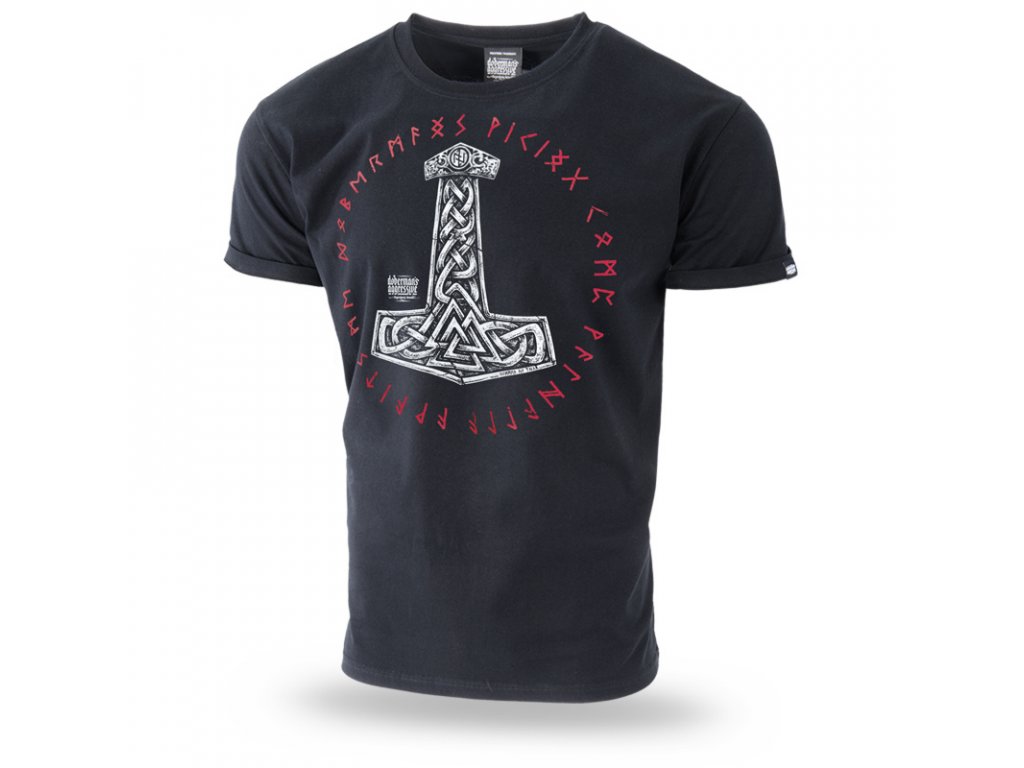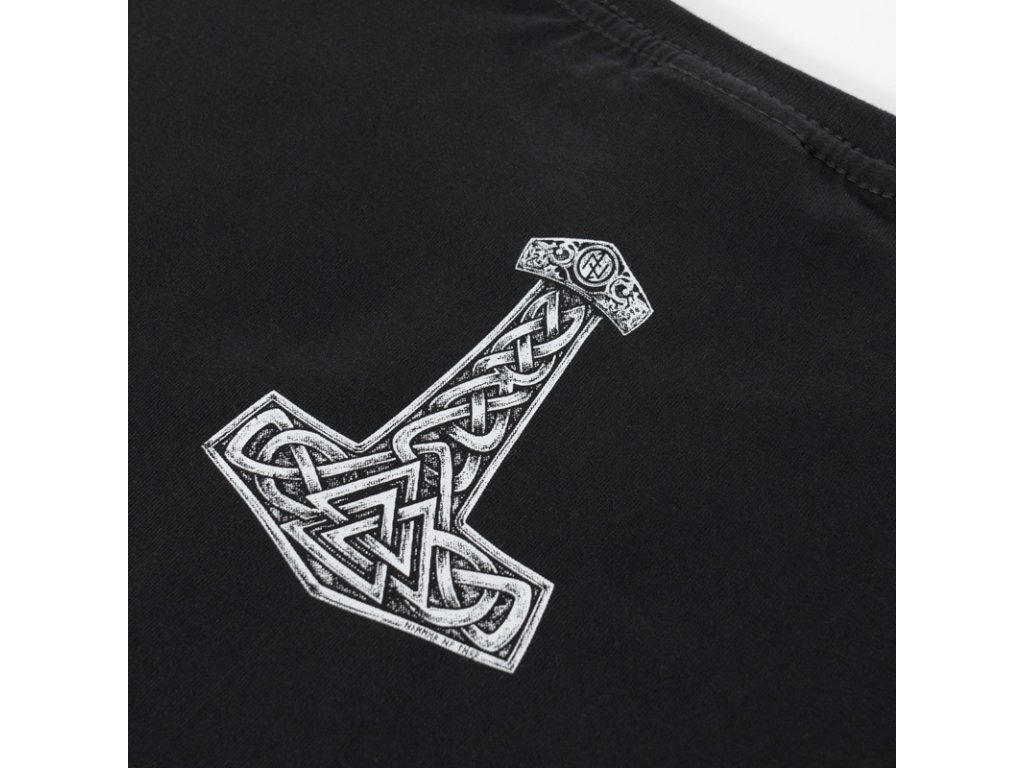 A póló bal ujján egy kis méretű céges logó található. A póló elején egy Thor kalapács és a márka logója található, amely piros rúna szimbólumokkal van körülvéve. A póló hátoldalán egy kis méretű Thor kalapács mintája található.