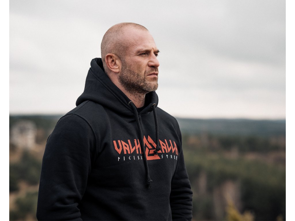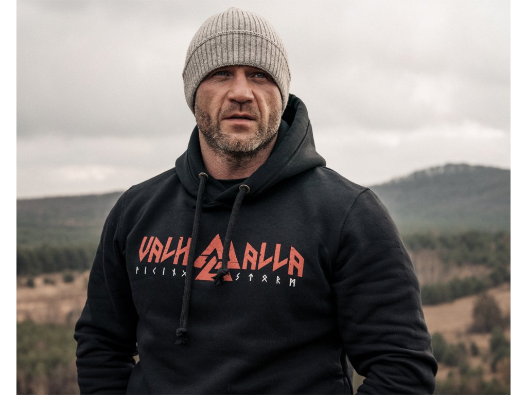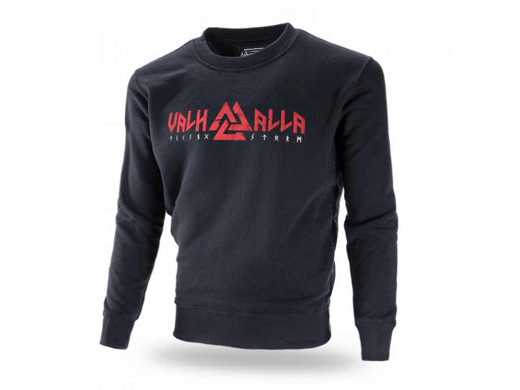 A bal ujjon egy kis címke található a márka logójával. A pulóver alsó része és az ujjak végei széles húzózsinórral vannak ellátva. A pulóver elején egy domború nyomattal készített Valhalla felirat található. A nyomatot egy északi szimbólum teszi teljessé.