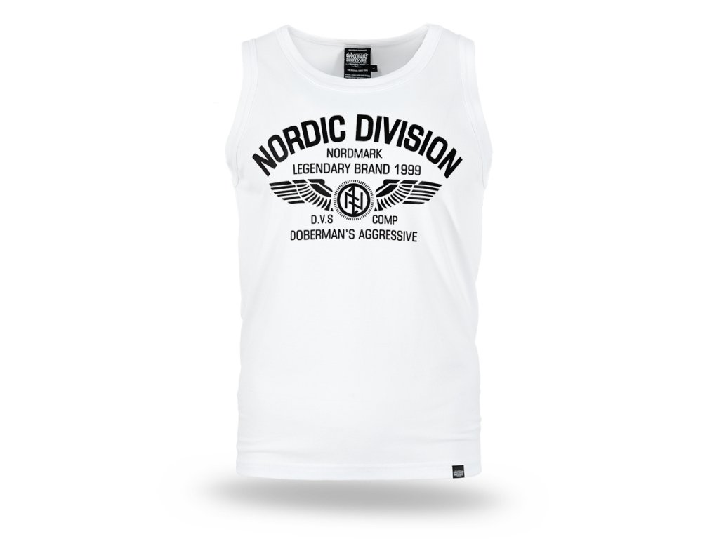Kényelmes, klasszikus szabású modell, amely szabad mozgást és mindennapi kényelmet biztosít. Az elején egy nagyméretű nyomat található „Nordic Division – Nordmark Legendary Brand 1999” felirattal, amelyet szárnyakat ábrázoló grafika és a márka emblémája egészít ki. A design északi és katonai stílus által inspirált, amely kiemeli a márka jellegzetes és könnyen felismerhető karakterét. Az ujjatlan póló kerek nyakkivágással és szélesebb karkivágásokkal készült, így jól illeszkedik a testhez, és alkalmas sporttevékenységekhez valamint mindennapi viselethez is.