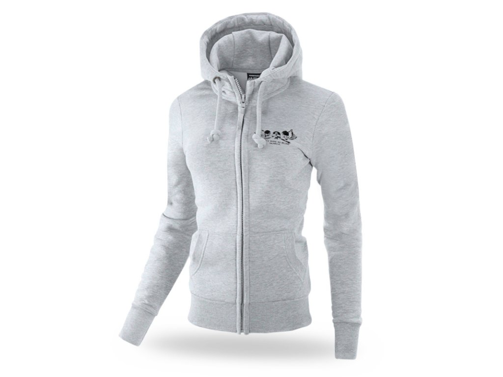 Női cipzáras kapucnis pulóver. Nagyon kényelmes szabású és jó minőségű pamutból készült. A pulóver testre szabott és hosszabb szabású, ami jelentősen növeli a viselés kényelmét.