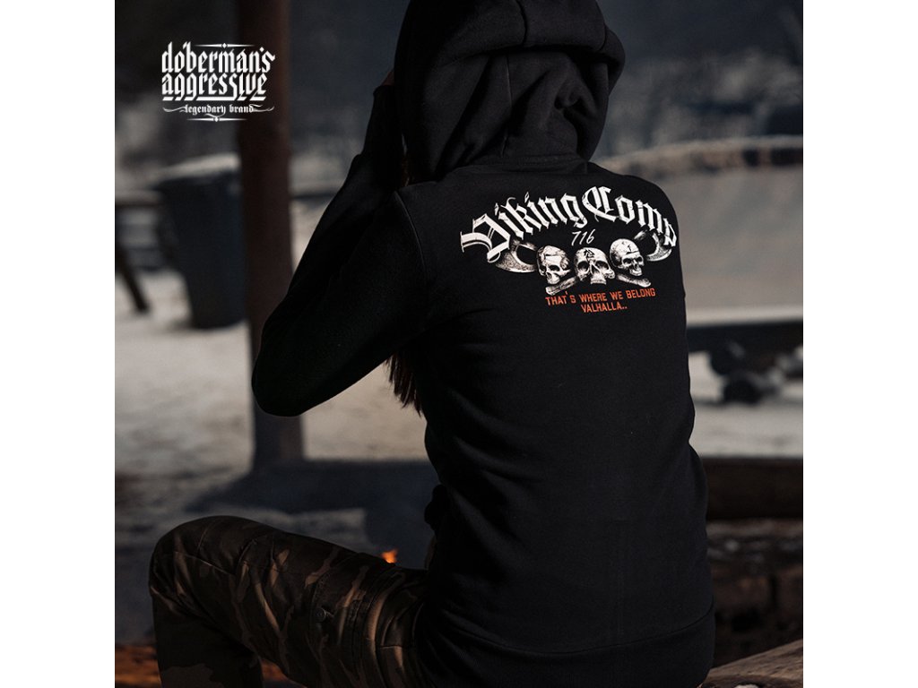 A pulóver alsó részén és az újjak végein elasztikus szegély található. A pulóver hátoldalán három koponyával és egy baltával kiegészített Viking Comp felirat található. A pulóver hátoldalát egy „That’s where we belong Valhalla” felirat egészíti ki.