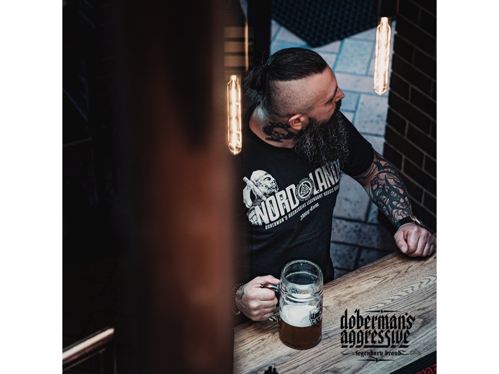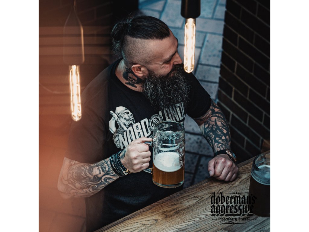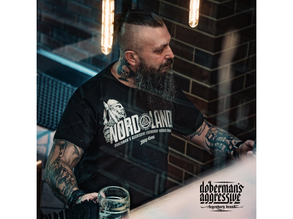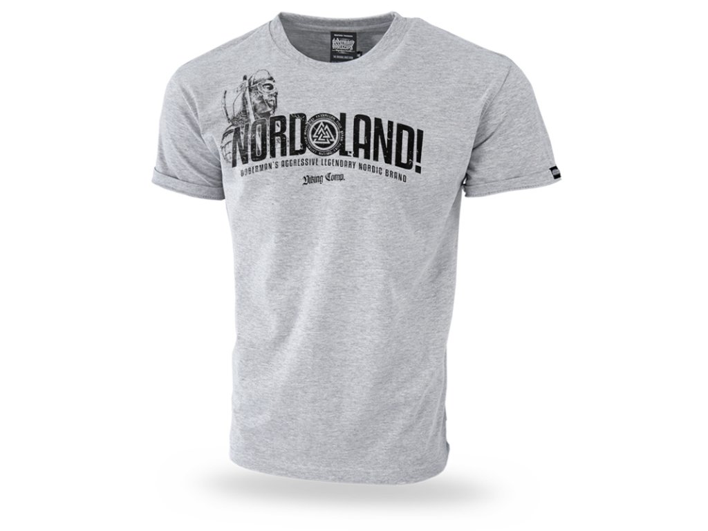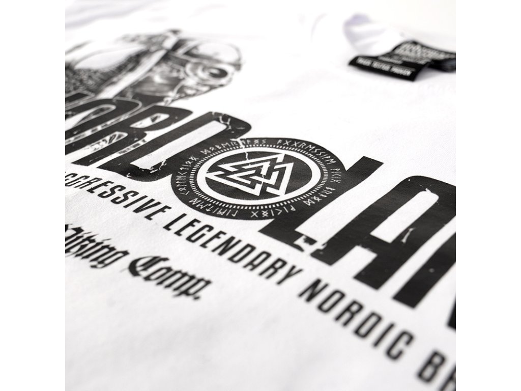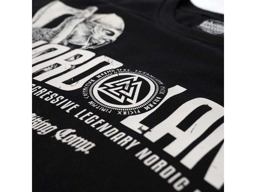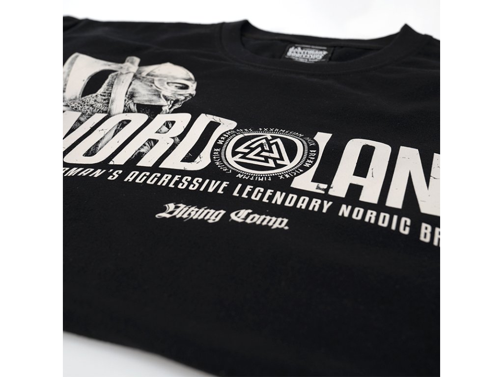 A póló elején egy nagy méretű Nordland felirat valamint egy sisakos viking található.