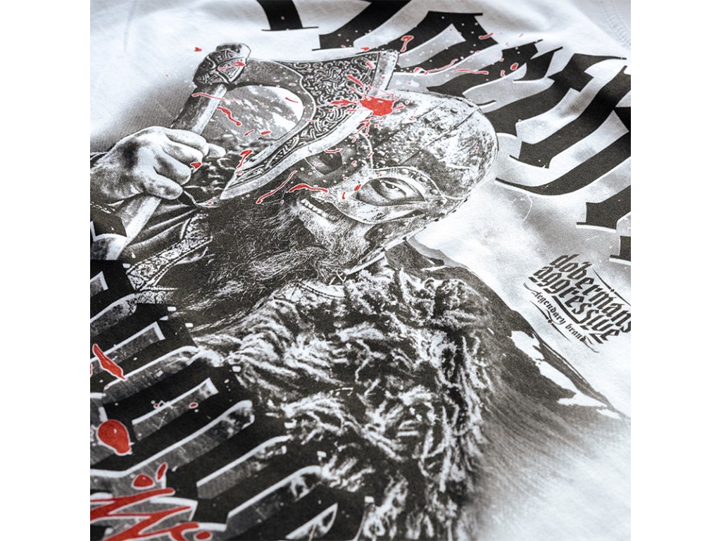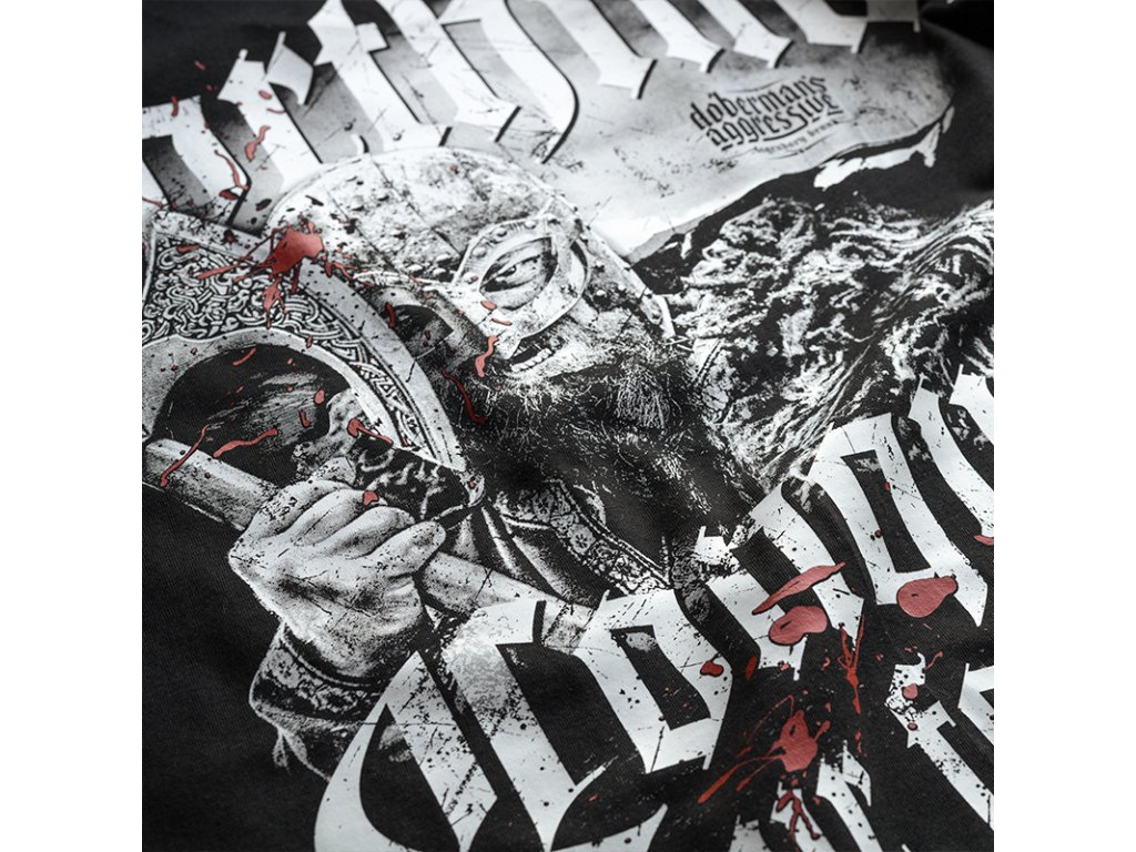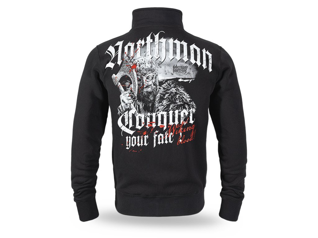 A pulóver elején két zseb található, bal ujján egy kis méretű Dobermans Aggressive logóval ellátott címke. A pulóver alsó része és az ujjak végei széles húzózsinórral vannak ellátva. A hátoldalon egy nagyméretű, baltát tartó viking minta található egy Northman Conquer your fate felirattal kiegészítve. A pulóver elején egy kisebb minta található, amely a fő motívumot követi.