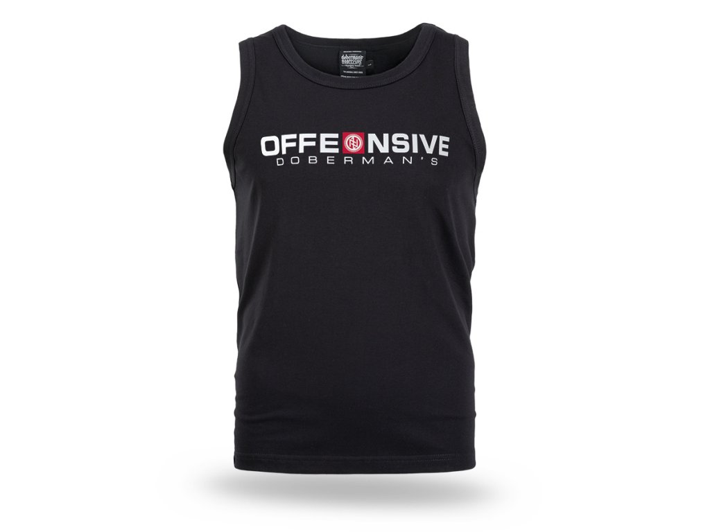 Ujjatlan modell klasszikus kerek nyakkivágással és rugalmas szegéllyel. Az elején markáns „OFFENSIVE DOBERMAN’S” felirat és a márka jellegzetes emblémája található, amely a kollekció dinamikus és határozott karakterét hangsúlyozza. Az egyszerű szabás szabad mozgást és kényelmes viseletet biztosít, különösen sportolás közben vagy melegebb napokon. A trikó a minimalista formát erőteljes, jól felismerhető grafikai elemmel ötvözi.