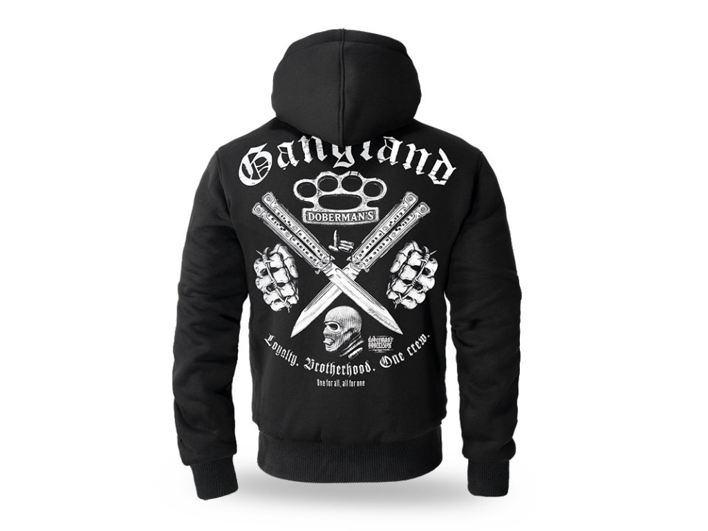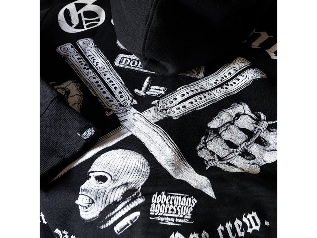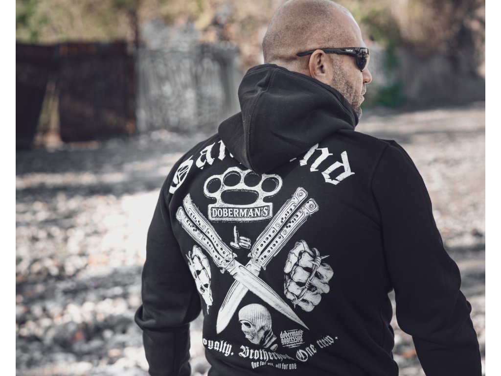 A hátoldalon egy merész nyomat látható bokszerrel, pillangókéssekkel, ökölbe szorított kezekkel és egy símaszkos figurával. Alatta a következő feliratok szerepelnek: Loyalty. Brotherhood. One crew. és One for all, all for one. Elöl, a mellrészen, kisebb nyomat található bokszerrel és Doberman's felirattal.