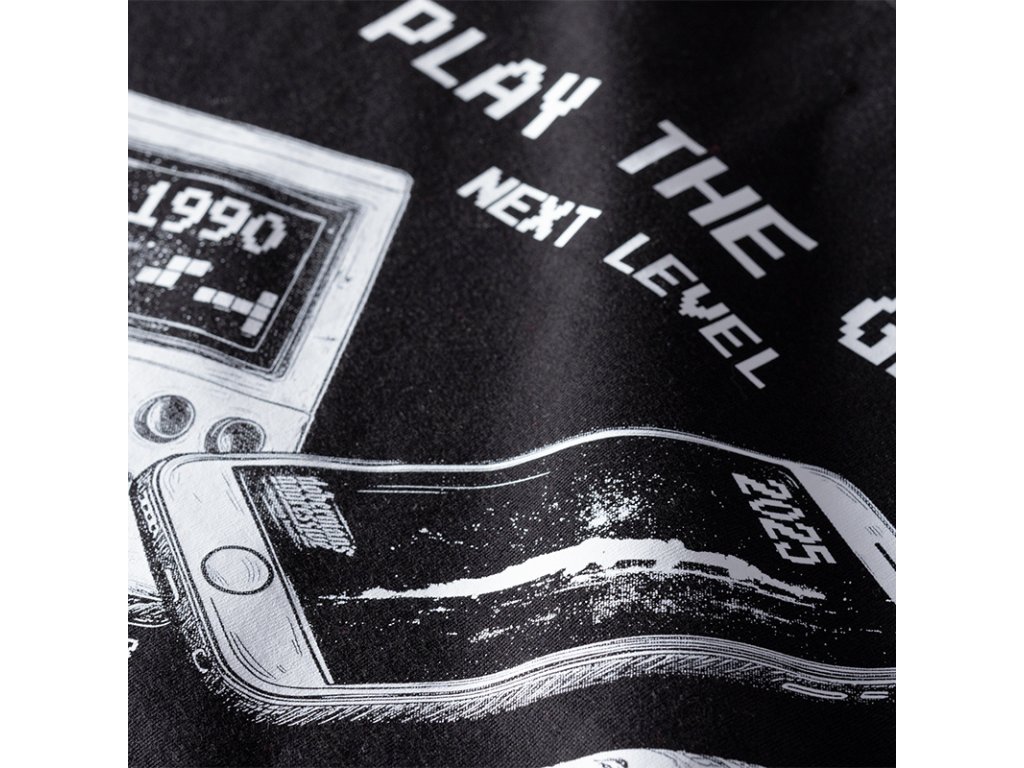 Kiváló minőségű pamutból készült ujjatlan póló, amely kényelmet és légáteresztő képességet biztosít. Az elején egy retro stílusú nyomat látható, amely egy 1990-es évekbeli kézi konzolt és egy modern, 2025-ös okostelefont ábrázol. A grafika felett a "PLAY THE GAME – NEXT LEVEL" felirat hangsúlyozza a technológia és a videojátékok fejlődését.