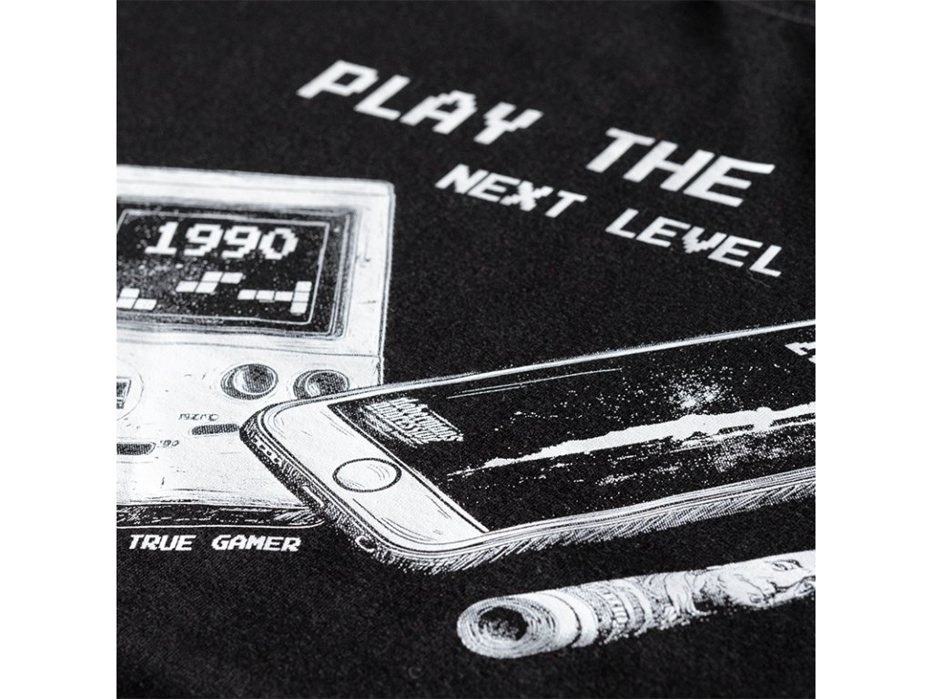 Kiváló minőségű pamutból készült ujjatlan póló, amely kényelmet és légáteresztő képességet biztosít. Az elején egy retro stílusú nyomat látható, amely egy 1990-es évekbeli kézi konzolt és egy modern, 2025-ös okostelefont ábrázol. A grafika felett a "PLAY THE GAME – NEXT LEVEL" felirat hangsúlyozza a technológia és a videojátékok fejlődését.