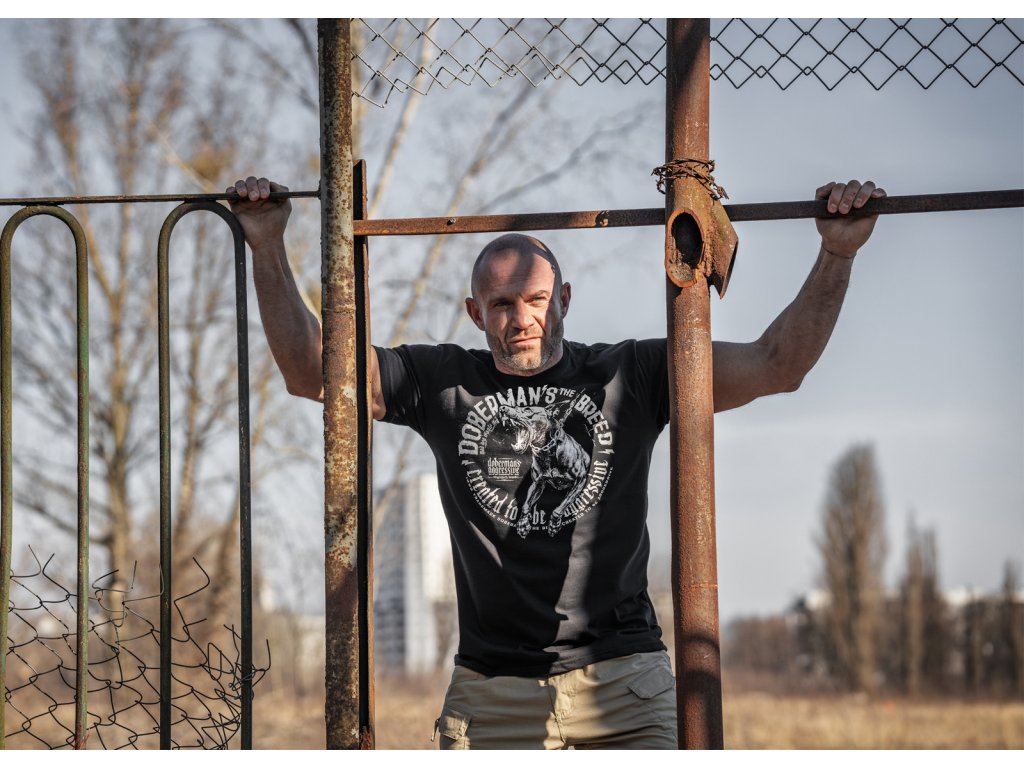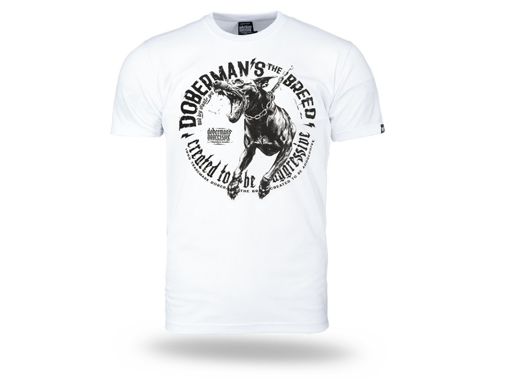 Kiváló minőségű, tartós szövésű pamutból készült, amely kényelmet és alakmegőrző képességet biztosít. Az elején egy dinamikus grafika látható egy agresszíven pózoló dobermannal, amelyet a következő feliratok vesznek körül: "DOBERMAN’S THE BREED" és "Created to be aggressive". Olyanok számára készült modell, akik értékelik a feltűnő motívumokat és a merész stílust.