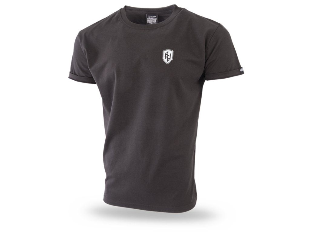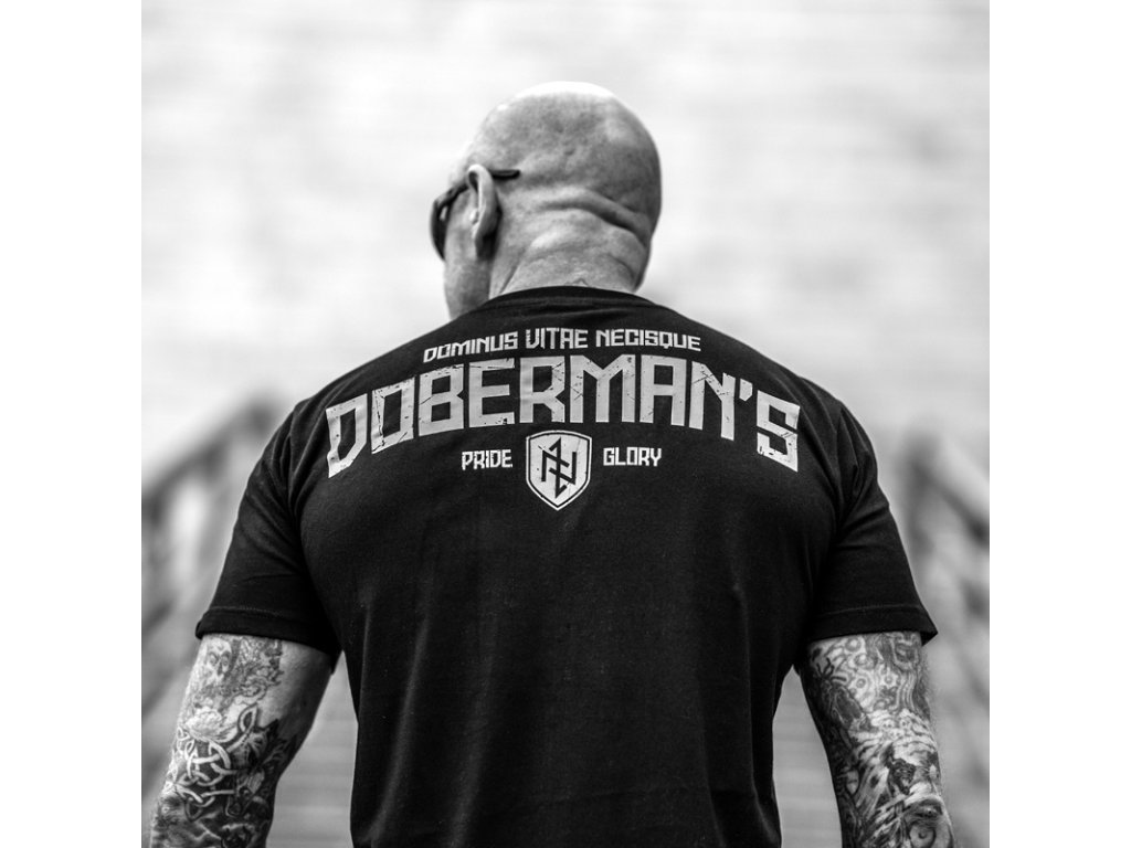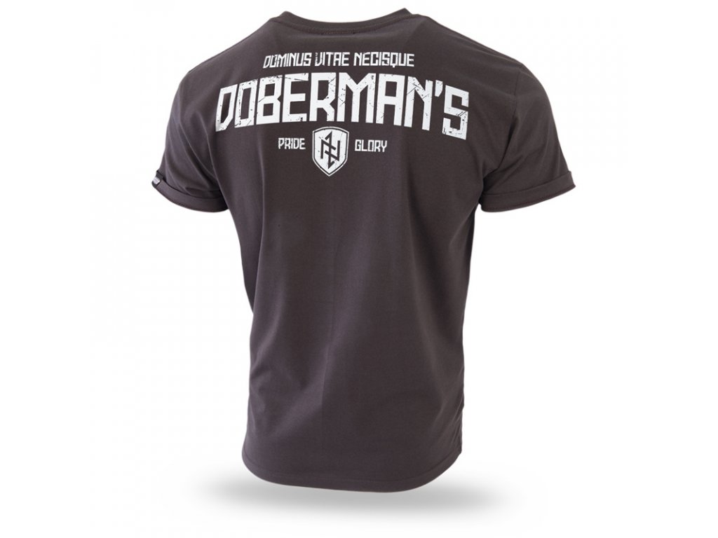 Klasszikus szabású férfi póló, amely kiváló minőségű pamutból készült. A póló bal ujján egy kis méretű céges logó található. A hátoldalon pajzsminta és egy nagy DOBERMAN'S Dominus Vitae Necisque felirat látható. A mellkas bal oldalán egy kis pajzs lenyomat található, rúna emblémával.