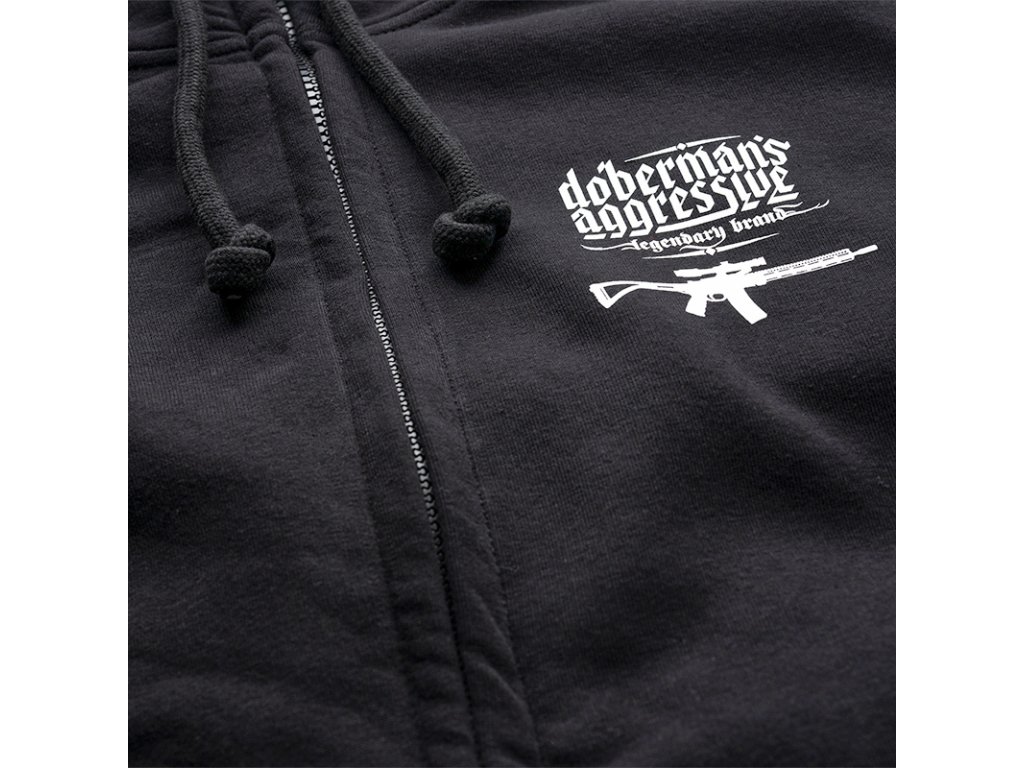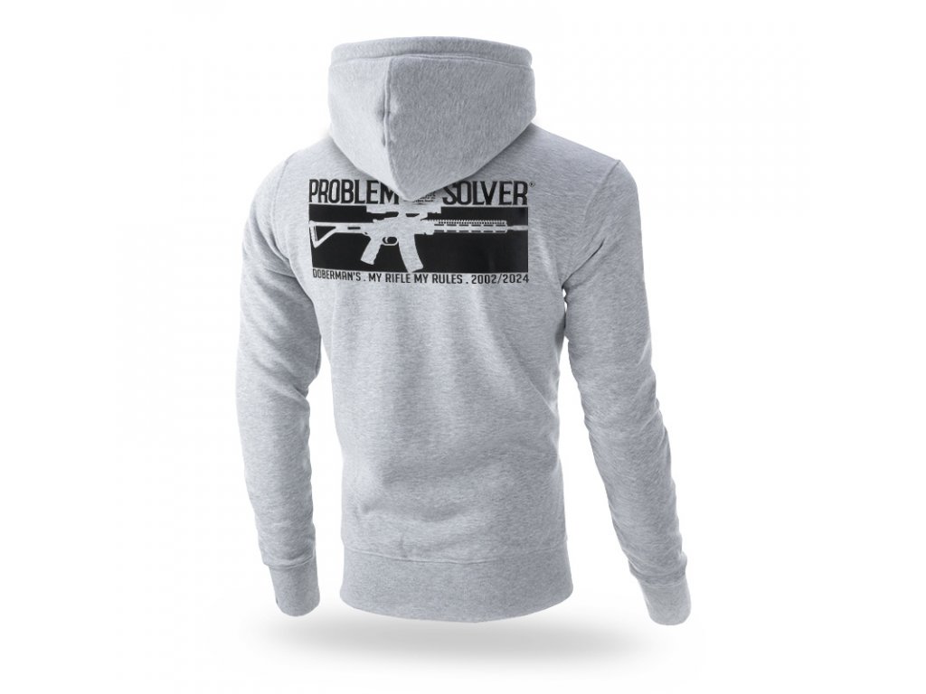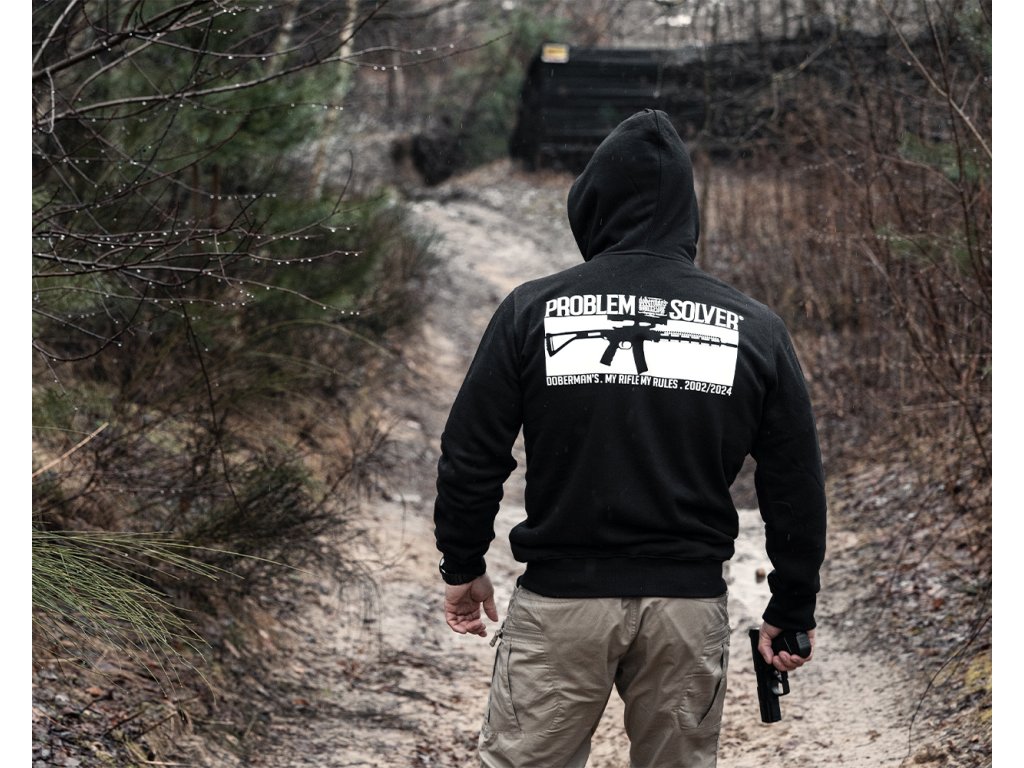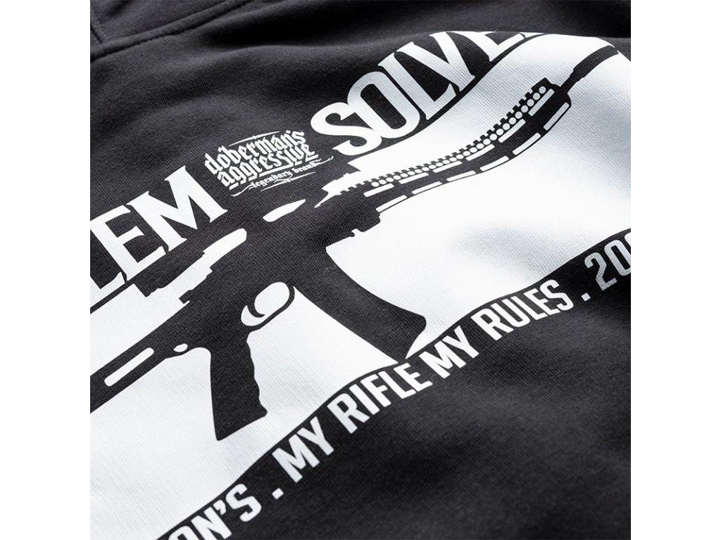 A kapucni beállításához praktikus fűzők szolgálnak, végein fémből készült logókkal. A pulóver elején két praktikus zseb található. A pulóver alsó részén és az újjak végein elasztikus szegély található. A pulóver bal ujján egy céges logó található. A hátoldalon egy géppuska minta található, PROBLEM SOLVER felirattal kiegészítve. A pulóver elején egy kisebb minta található, amely a fő motívum irányvonalát követi.