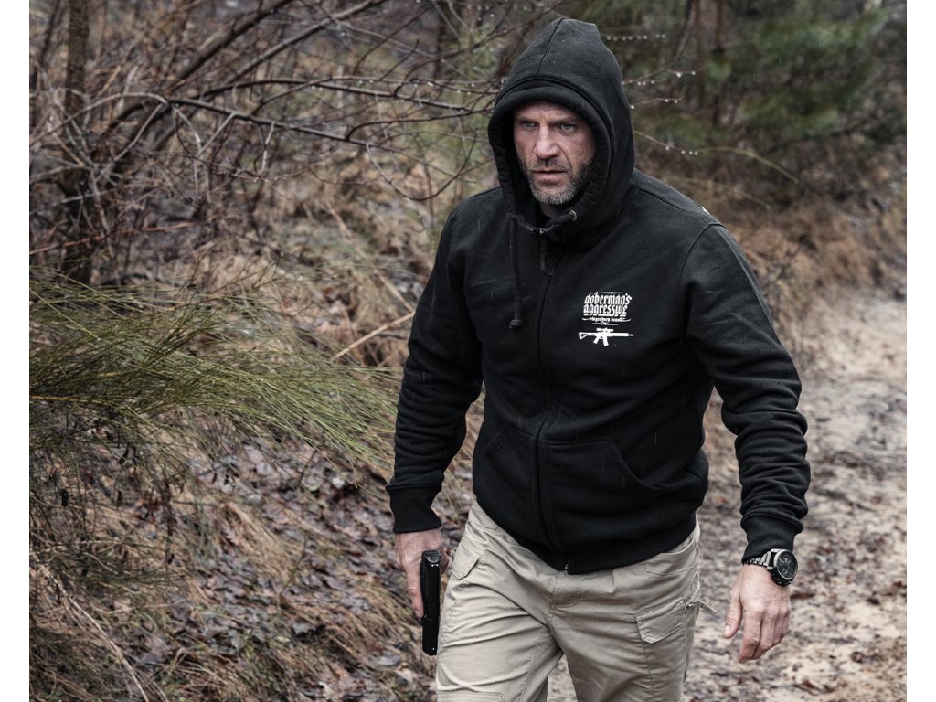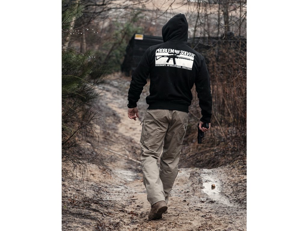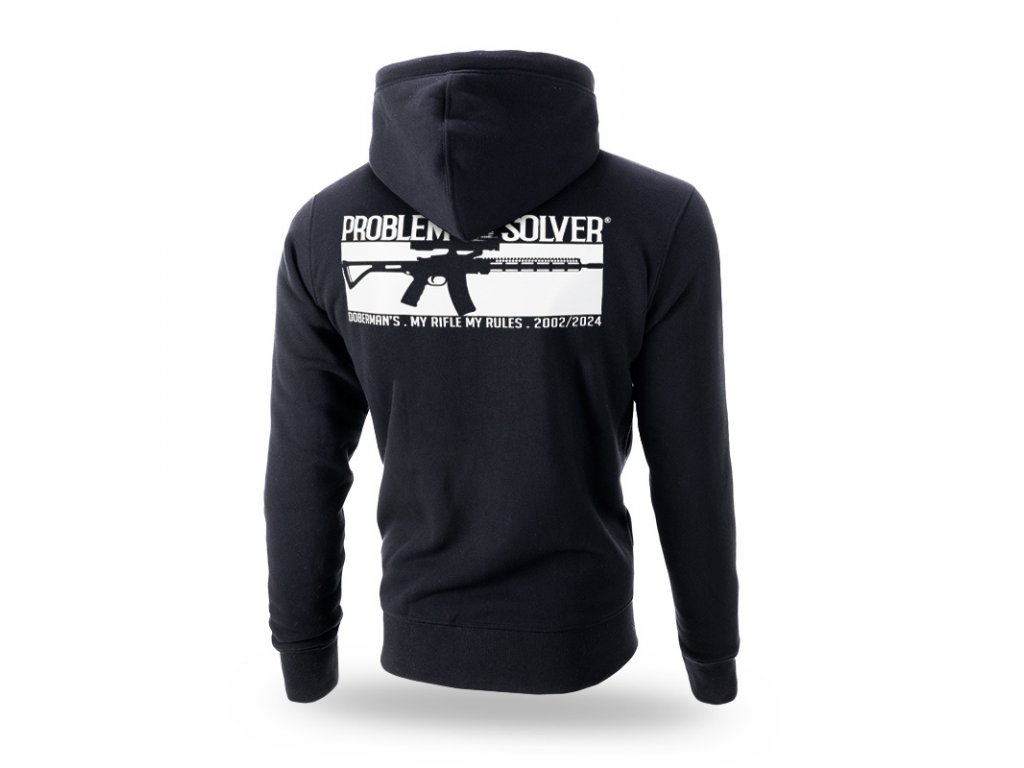 A kapucni beállításához praktikus fűzők szolgálnak, végein fémből készült logókkal. A pulóver elején két praktikus zseb található. A pulóver alsó részén és az újjak végein elasztikus szegély található. A pulóver bal ujján egy céges logó található. A hátoldalon egy géppuska minta található, PROBLEM SOLVER felirattal kiegészítve. A pulóver elején egy kisebb minta található, amely a fő motívum irányvonalát követi.