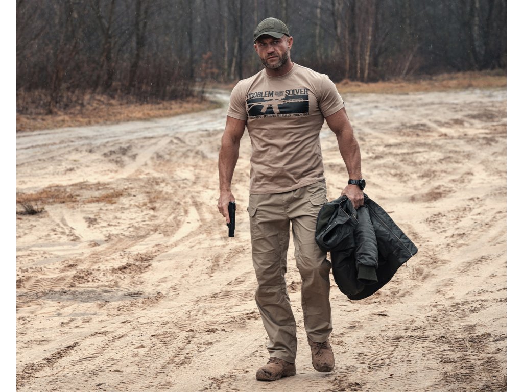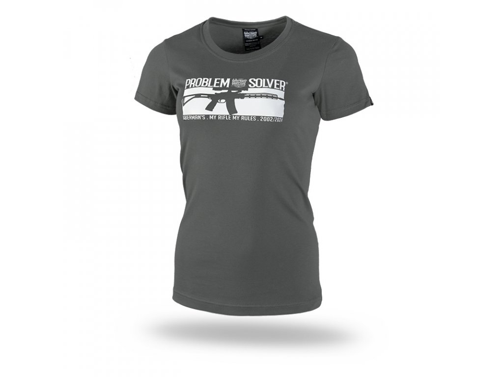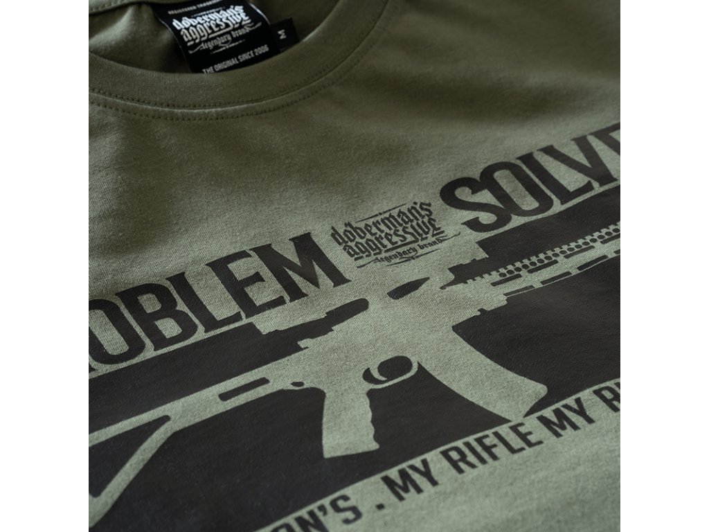 A bal ujjon egy kis méretű logó található. A póló elején egy géppuska és egy PROBLEM SOLVER felirat található.