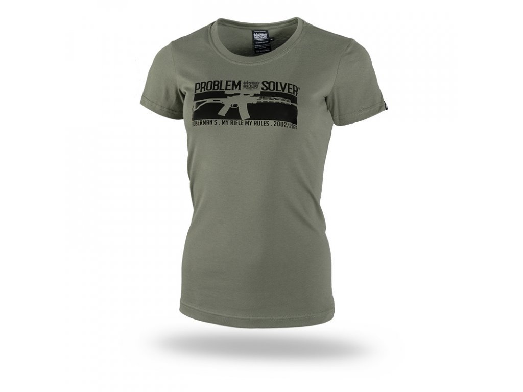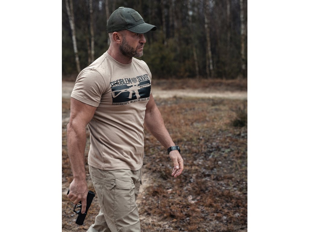 A bal ujjon egy kis méretű logó található. A póló elején egy géppuska és egy PROBLEM SOLVER felirat található.