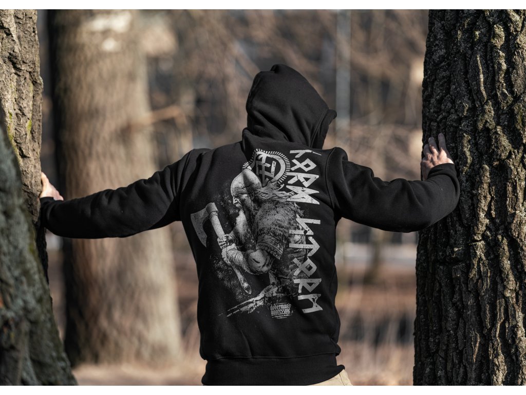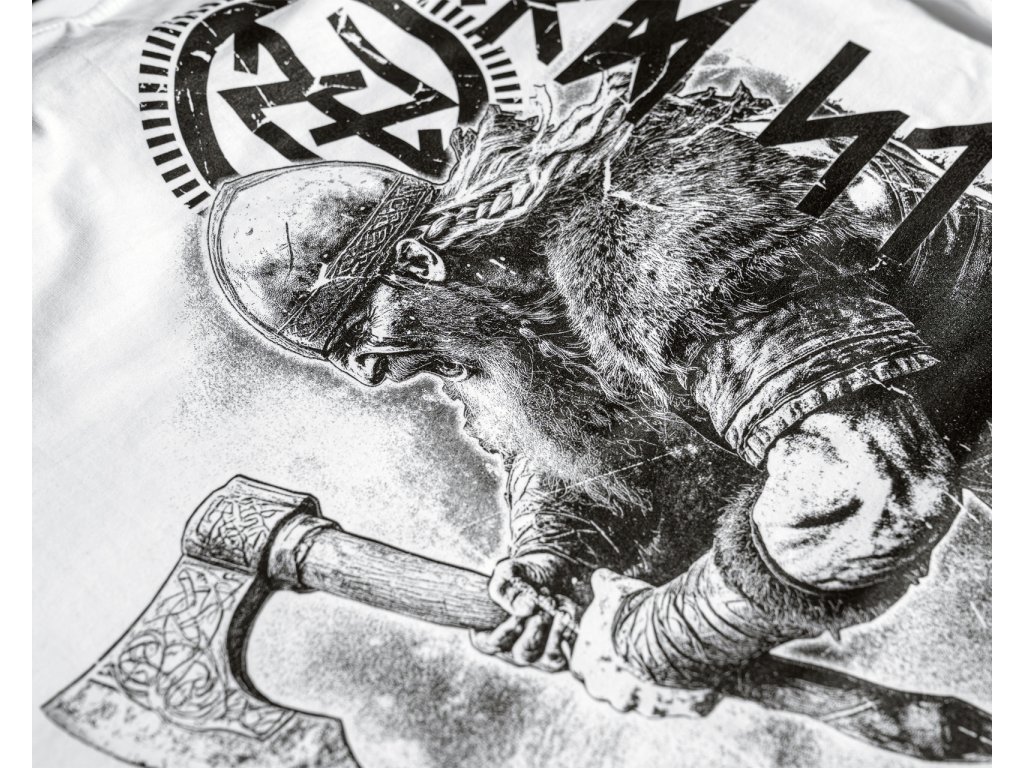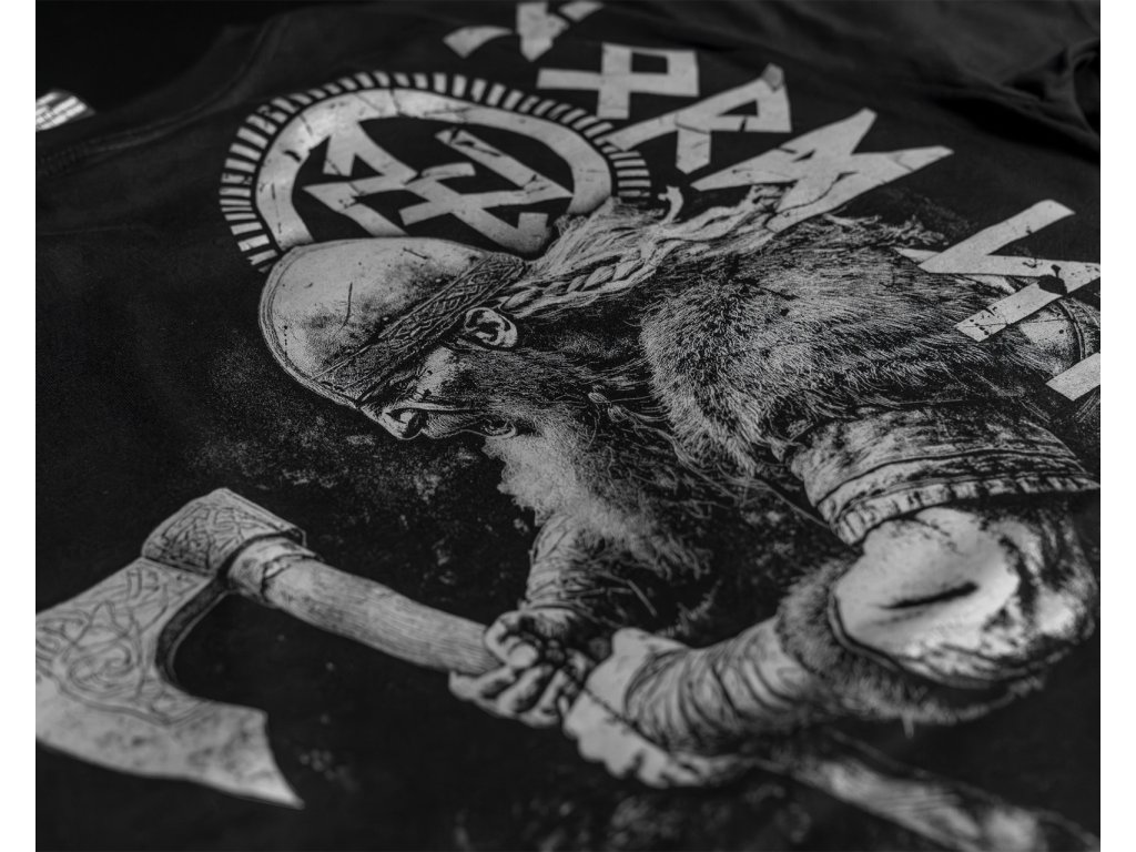Klasszikus pulóver lenyűgöző hátoldali nyomattal, amely egy harcra kész, dinamikus pózban álló vikinget ábrázol fejszével. Az elején minimalistikus STORM felirat található rúnás stílusban. Kiváló minőségű anyagból készült, amely garantálja a kényelmet és a tartósságot.