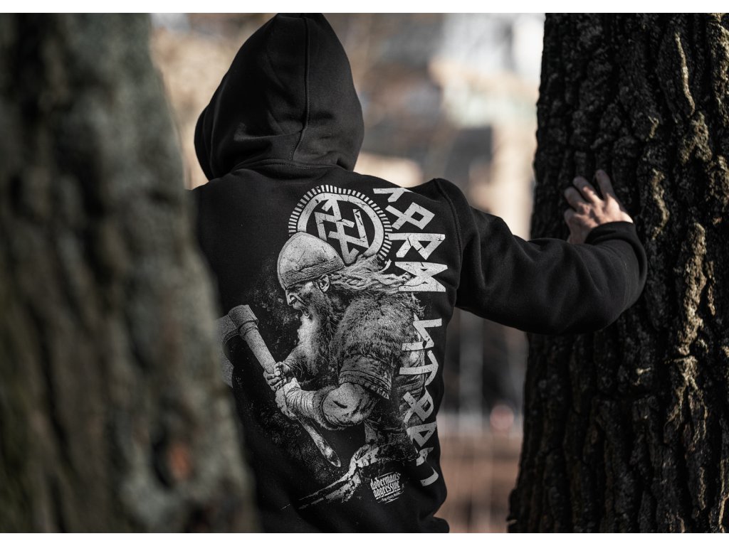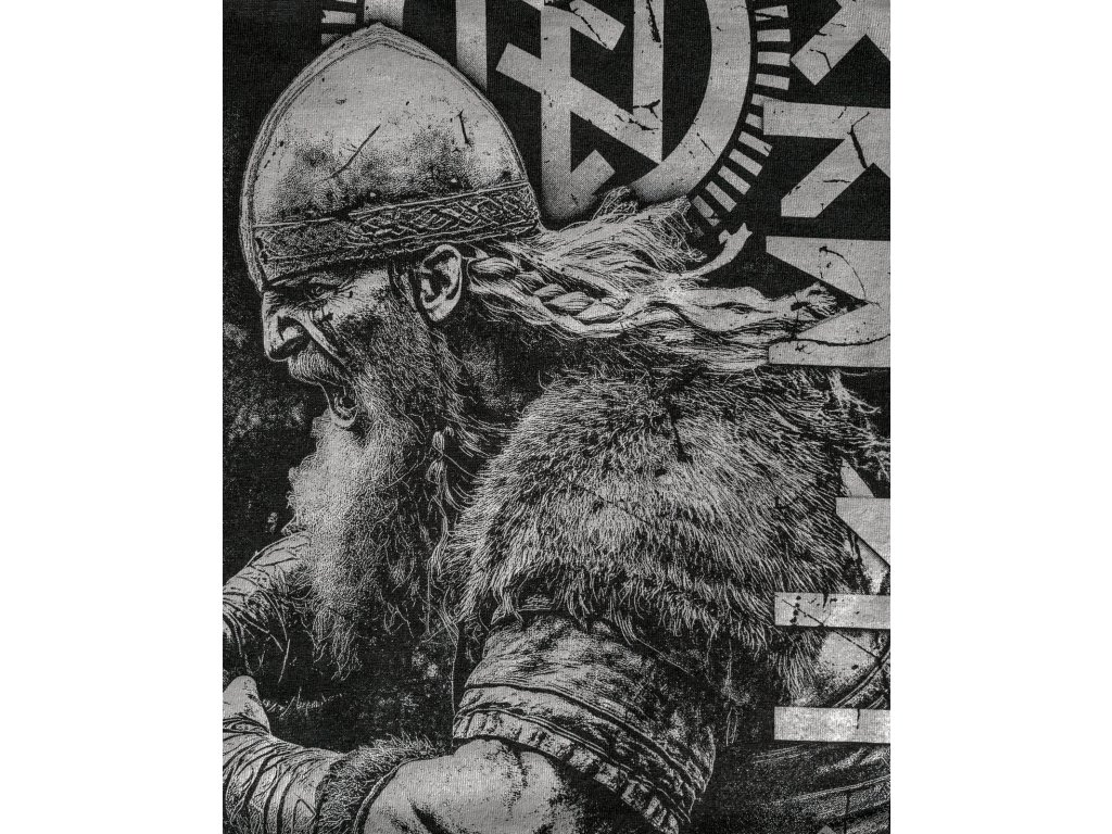 Klasszikus pulóver lenyűgöző hátoldali nyomattal, amely egy harcra kész, dinamikus pózban álló vikinget ábrázol fejszével. Az elején minimalistikus STORM felirat található rúnás stílusban. Kiváló minőségű anyagból készült, amely garantálja a kényelmet és a tartósságot.