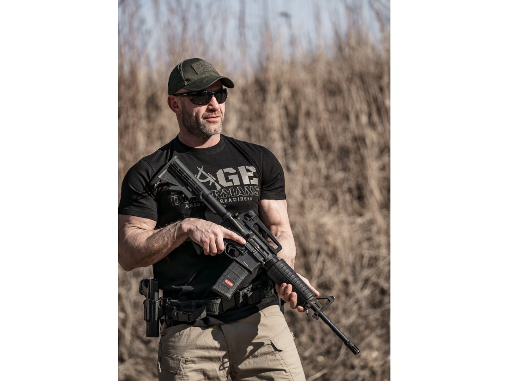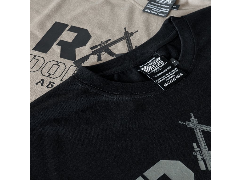 A póló kiváló minőségű pamutból készült. A bal ujjon egy kis címke található a márka logójával. A póló elején a RAGE DOBERMANS felirat látható katonai betűtípussal. A modell jellegzetes eleme a két, egymással keresztezett puska, amelyek A betűt alkotnak.