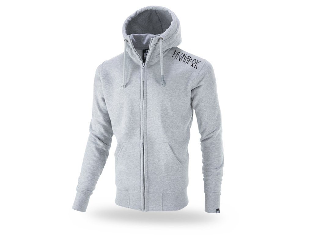 Magas gallérral. Fém vasalat és zsinór kapucninál. Piros díszítéssel cimke formájában, belső rancolás és márka embléma, sas jelképe. Bal vállán Ragnarok felirat rúnai stilusban. Hátán nagy grafika kelt szimbólumokkal, rovásírásos motívumok és dísztárgyak. Minta átmegy a jobb ujj varráson át. Lentebb megismételve Ragnarok felirata piros szinben.
