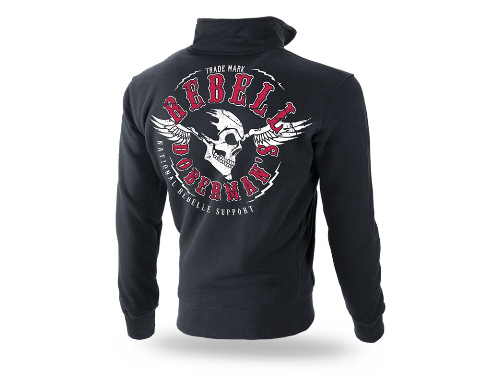 Körben villámcsapás és Rebell Doberman's kétszínű felirata. Grafikának repedés hatása van és elfoglalja jelentős hátteret. Elején egy kis díszített embléma, ugyanazzal a motívummal. Egyenes férfi pulóver klasszikus vágással, magas gallérral és tartos mangyettával.Közepén piros ránc márkajelzéssel és egy színes cimke sas szimbólummal, oldalán márka betét. Összetétel: 100% pamut (200g) vastagságú.