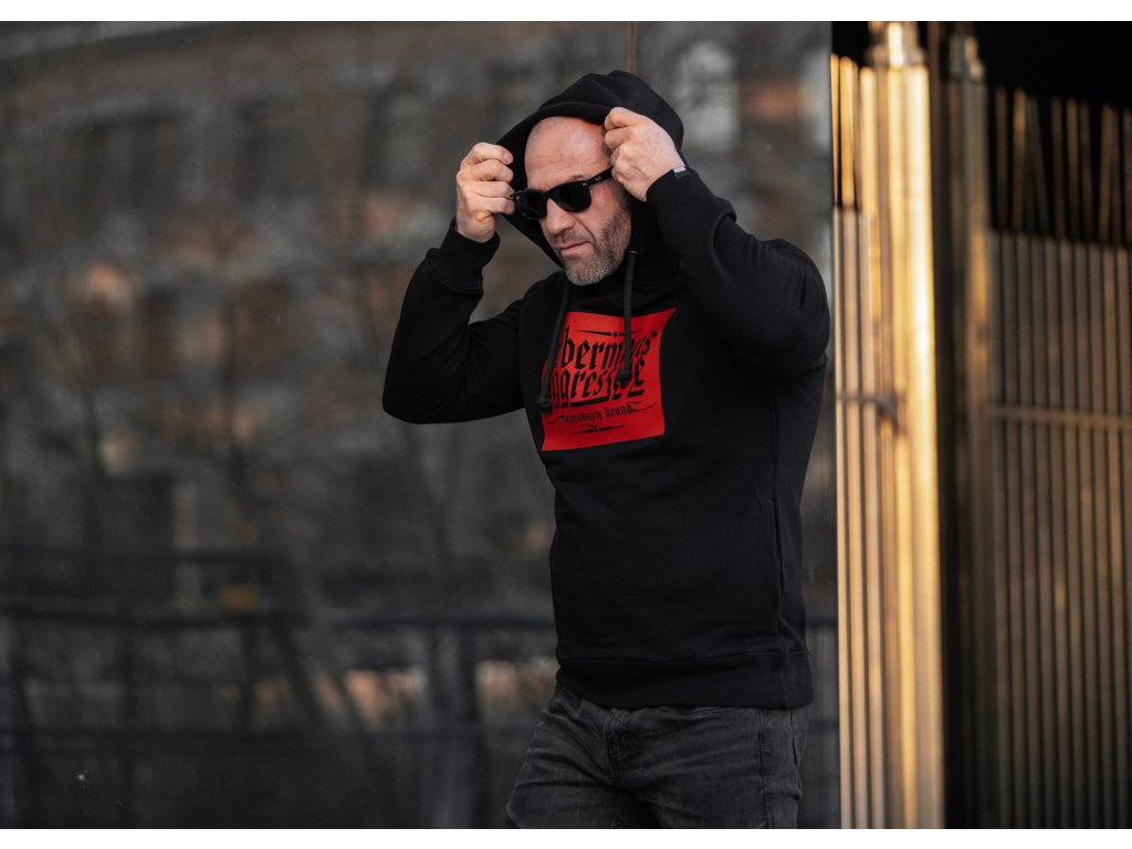A pulóver alsó része és az ujjak széles húzózsinórral vannak lezárva. A bal ujjon egy kis címke található a márka logójával. A pulóver elején egy gumi rátét található, téglalapba ágyazott Doberman's logóval.
