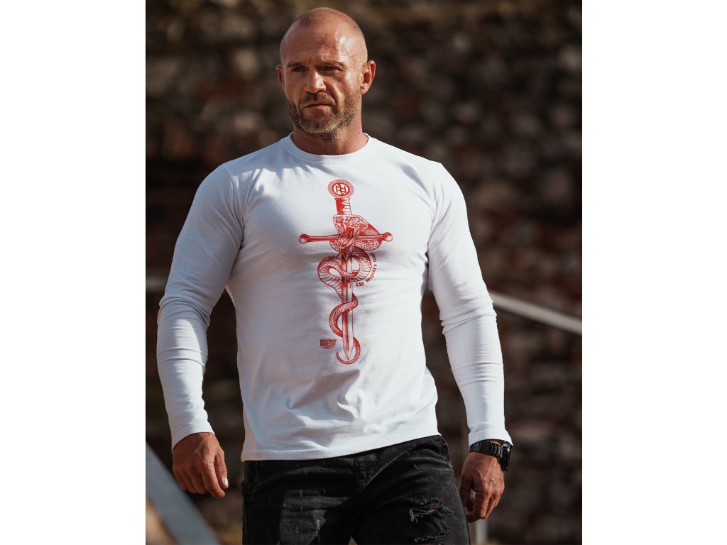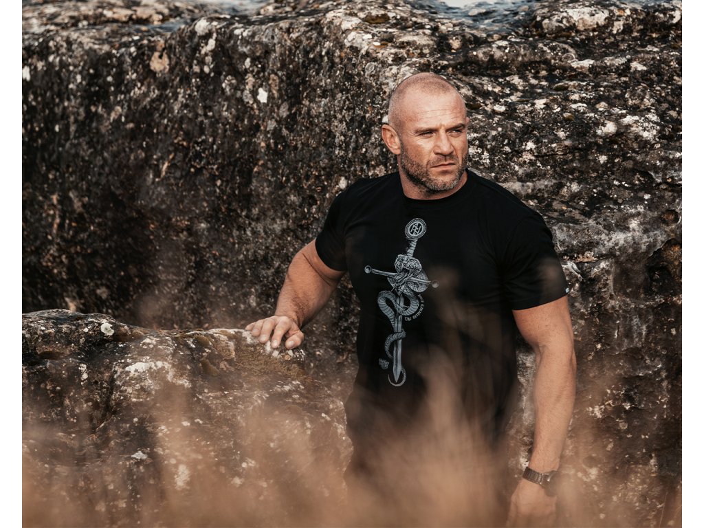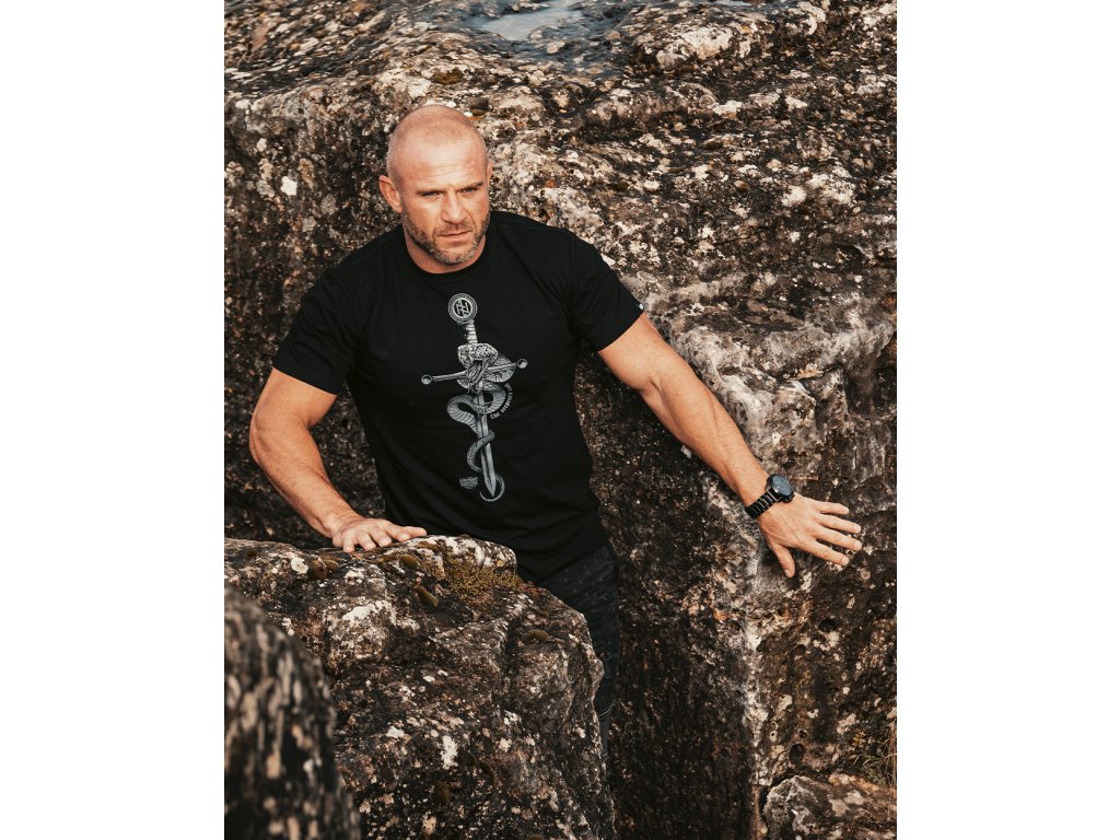 A trikó alsó részén egy kis címke található a márka logójával. A trikó elején egy kard köré tekeredő kígyó képe található. A mintát a The Serpent’s Trail szöveg teszi teljessé.
