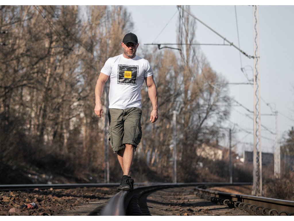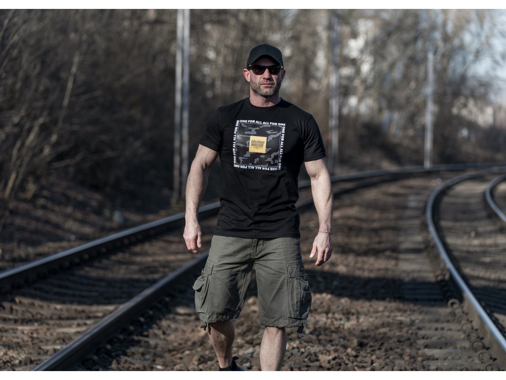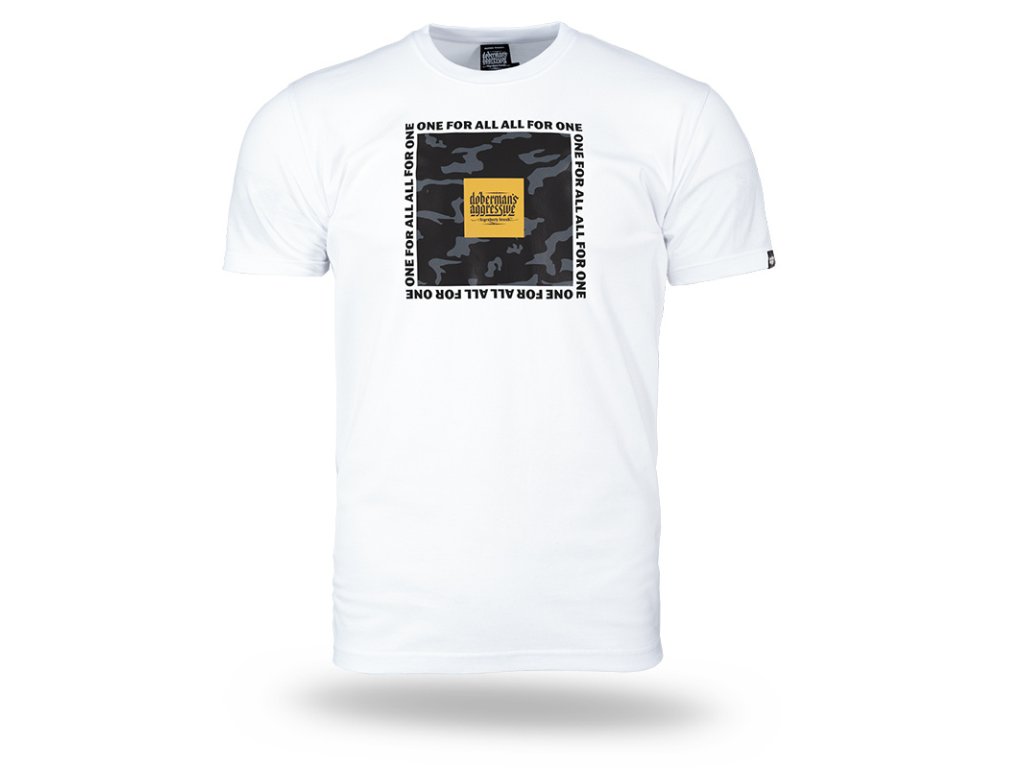 Férfi póló kiváló minőségű pamutból, amely kényelmes viseletet biztosít. Az elején egy nagy, négyzet alakú nyomat található terepmintával és kontrasztos Doberman's Aggressive logóval. A grafika körül a „ONE FOR ALL, ALL FOR ONE” felirat olvasható. Egy modell azoknak, akik értékelik az egyedi mintákat és a modern utcai stílust.