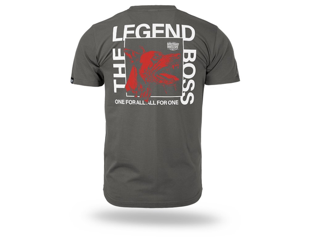 Kiváló minőségű pamutból készült, kényelmes viseletet és tartós nyomatot biztosít. A hátoldalon nagy grafika látható egy dobermannal és a „THE LEGEND BOSS” valamint a „ONE FOR ALL. ALL FOR ONE” feliratokkal. A mellrészen egy kisebb, a fő motívumhoz illő felirat található.
