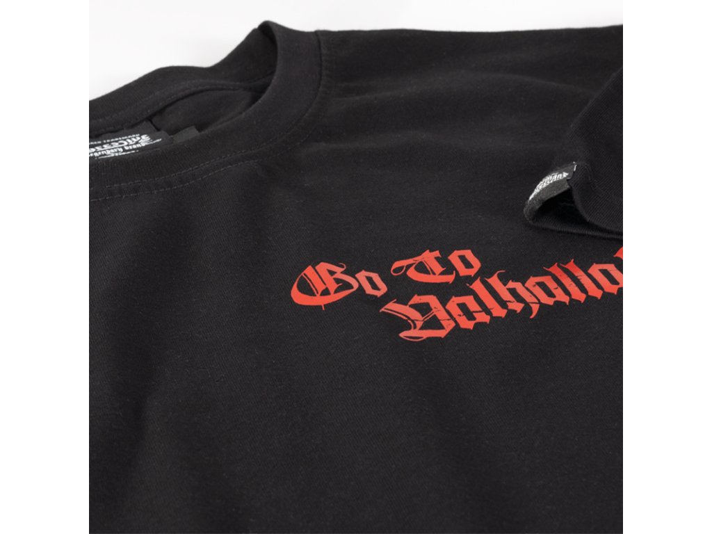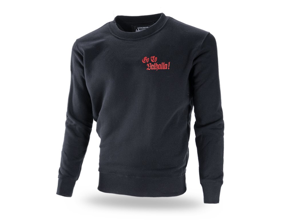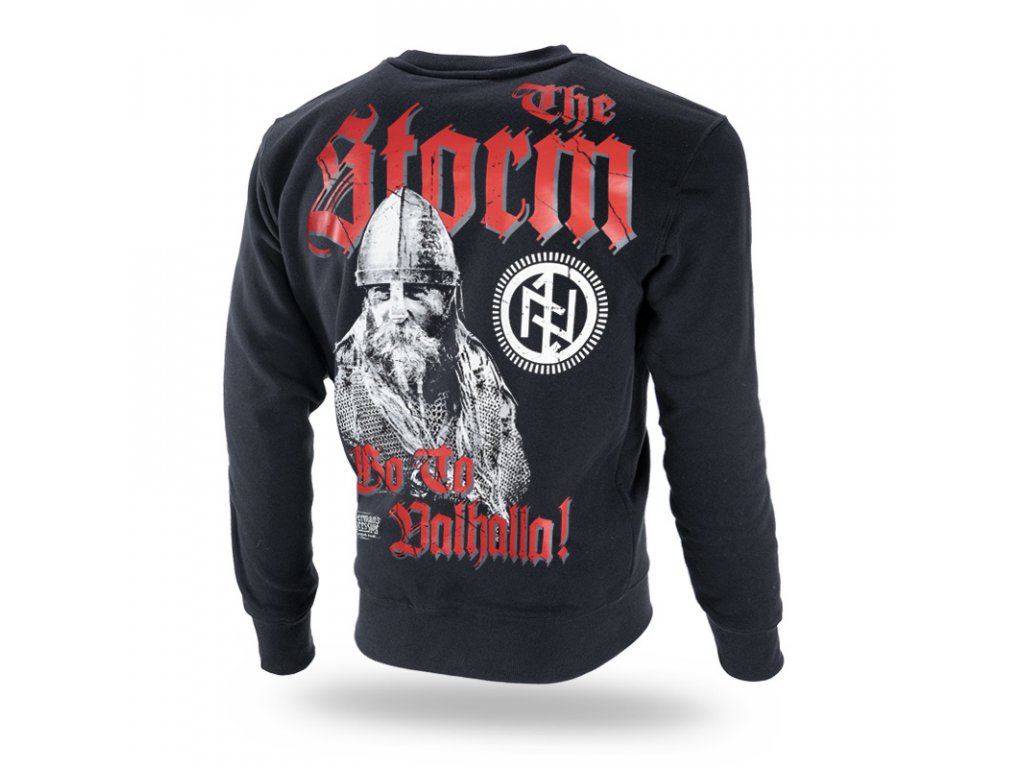 A pulóver kiváló minőségű pamutból készült. A pulóver hátoldalán egy vikinget ábrázoló nagy méretű minta, valamint egy THE STORM GO TO VALHALLA felirat és egy kis Doberman's Aggressive logó található. A pulóver elejét egy kis méretű Go to Valhalla felirat díszíti.