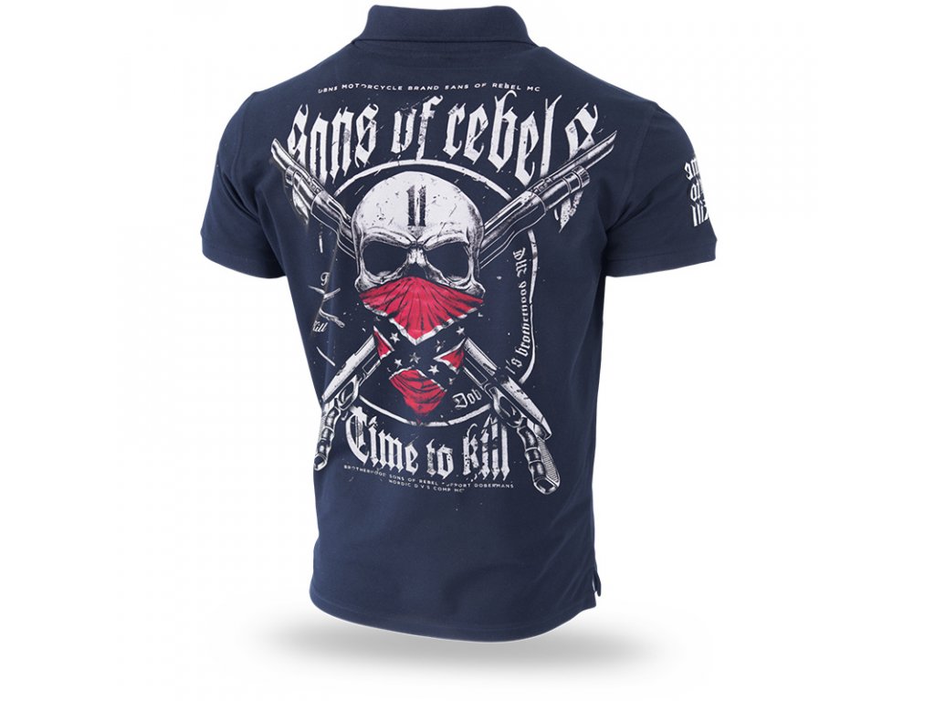 A pólóing hátoldalán egy motoros stílusú minta található, gótikus betűkkel körülvéve. A Sons of Rebel és a Time to Kill feliratok között egy konföderációs sállal körbevett koponya található, a háttérben két keresztezett puskával. A pólóing bal ujján egy Doberman’s Aggressive logó és Time to Kill felirat található.