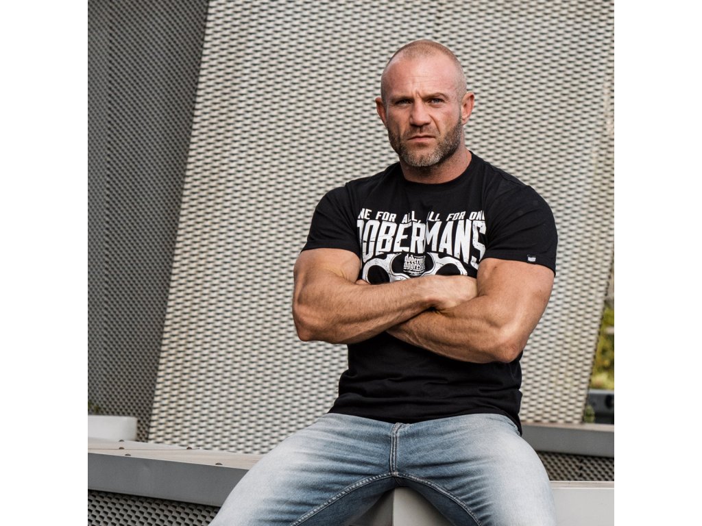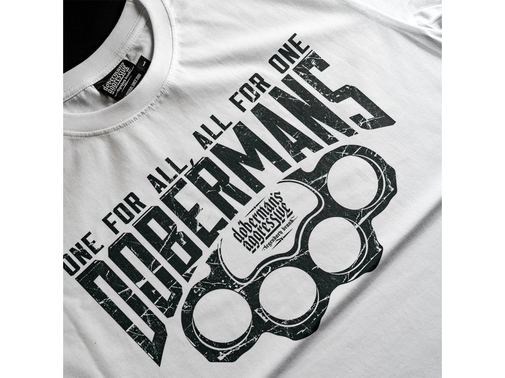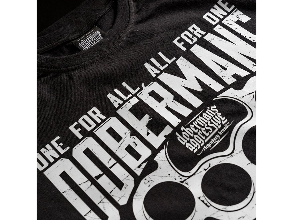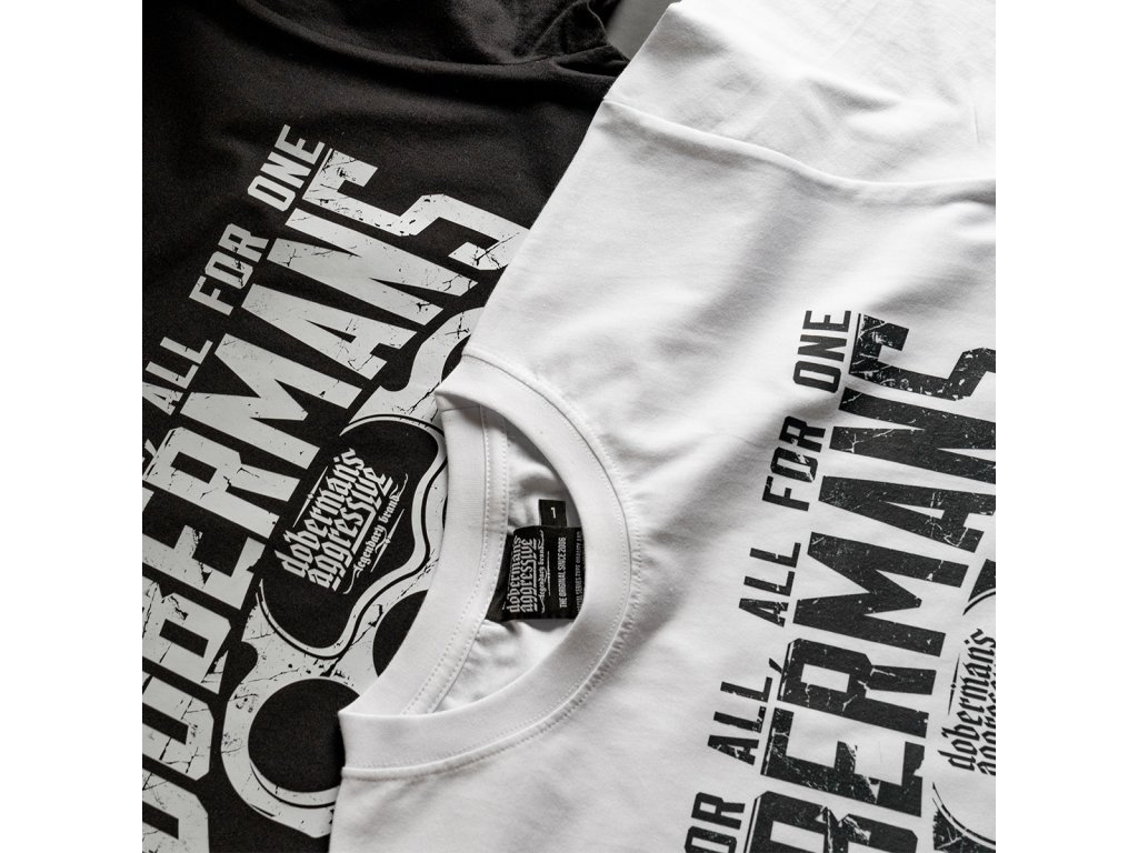 A póló kiváló minőségű pamutból készült. A bal ujjon egy kis címke található a márka logójával. A póló elején egy nagy DOBERMANS felirat található One For All, All For one felirattal. Az egészet egy boxer minta és a márka logója teszi teljessé.