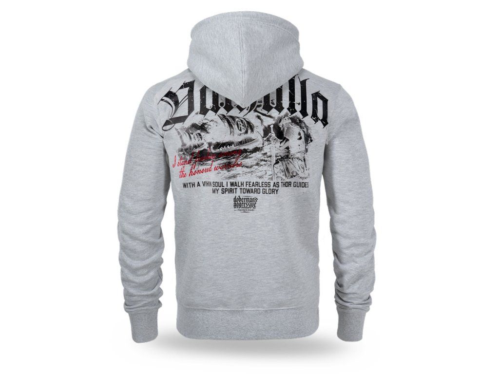 Állítható, zsinóros kapucnival és teljes hosszúságú cipzárral készült modell. Elöl két kenguruzseb található. A bal mellrészen egy kisebb „Valhalla” felirat és grafikai szimbólum kapott helyet. A hátoldalt egy nagyméretű, látványos, skandináv mitológia ihlette nyomat díszíti – harcos motívummal és jellegzetes „Valhalla” tipográfiával. A dizájnt a bátorságra, becsületre és harcra utaló szlogenek teszik teljessé, kiemelve a projekt nyers, harcos jellegét.