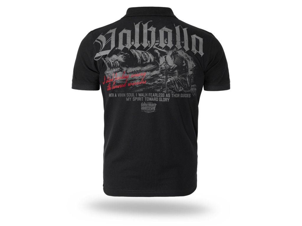 Egyszerű és kényelmes szabású modell, gallérral és gombos nyakrésszel. A bal mellrészen diszkrét „Valhalla” felirat és grafikai szimbólum található. A hátoldalt egy nagyméretű, látványos, skandináv mitológia ihlette nyomat díszíti – harcos motívummal és hangsúlyos „Valhalla” tipográfiával. Az összhatást a becsületre, bátorságra és harcra utaló szlogenek teszik teljessé, kiemelve a dizájn nyers, harcos jellegét.