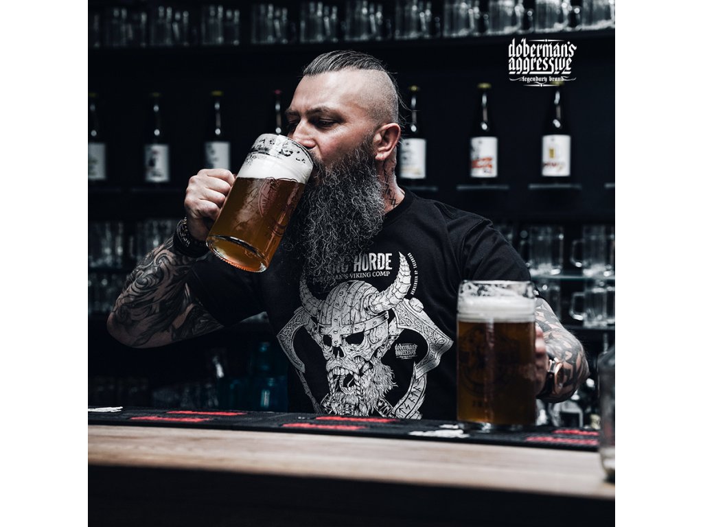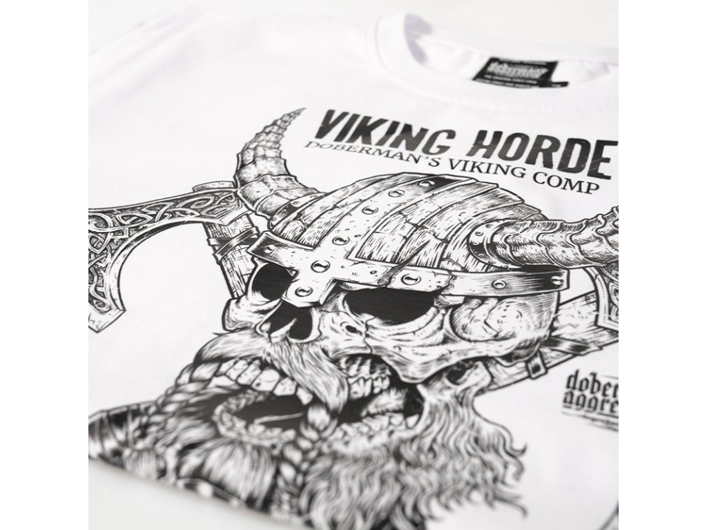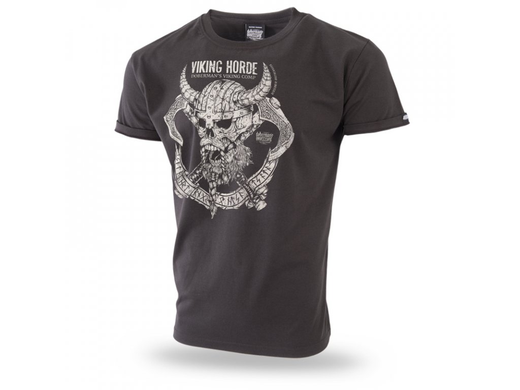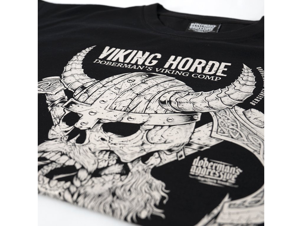 A póló elejét egy sisakos viking koponyája valamint két skandináv díszítésű balta díszíti. A póló bal ujján egy kis méretű céges logó található.