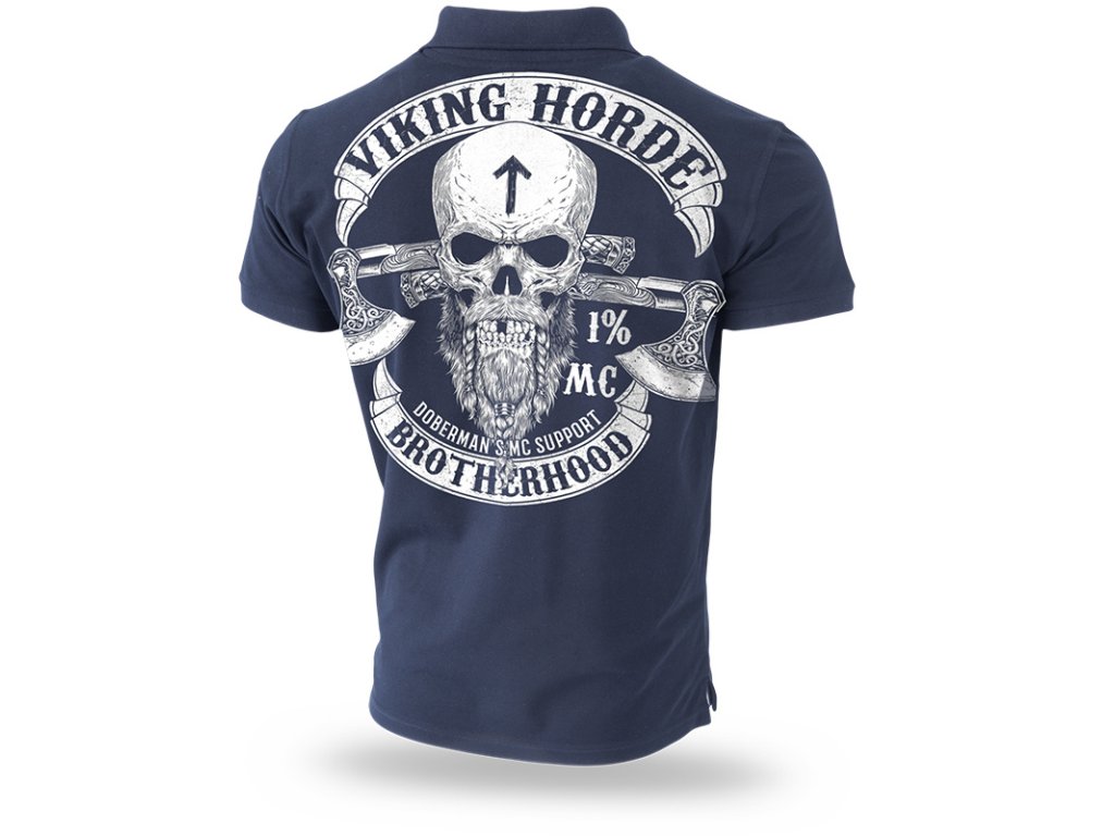 A pólóing a Vikings kollekció modellje. A pólóing elülső részét három Viking koponya díszíti. A pólóing hátoldalán egy nyomat található, amely egy koponyát és két fejszét ábrázol. Körülötte két zászló, amelyeket Viking Horde és Broterhood felirat díszít. A nyomat kopottas hatást kelt.