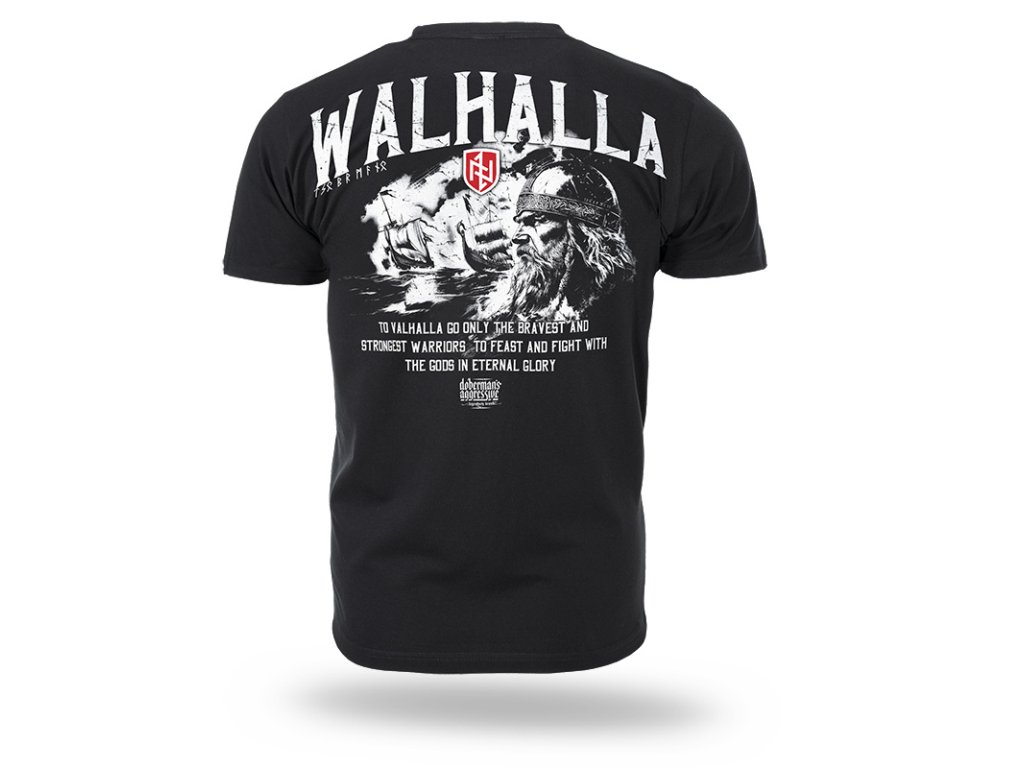 Klasszikus póló kiváló minőségű pamutból, amely kényelmes viseletet biztosít. Az elején egy visszafogott logó látható egy kis címer formájában, amely minimalista jelleget kölcsönöz neki. A póló hátulját egy nagy grafika díszíti, amely egy vikinget ábrázol hajók hátterében, a „WALHALLA” felirattal körülvéve. A dizájnt a következő szöveg egészíti ki: „To Walhalla go only the bravest and strongest warriors to feast and fight with the gods in eternal glory”, amely a skandináv mitológiára utal. Egy modell azok számára, akik értékelik a nyers esztétikát és a viking motívumokat.